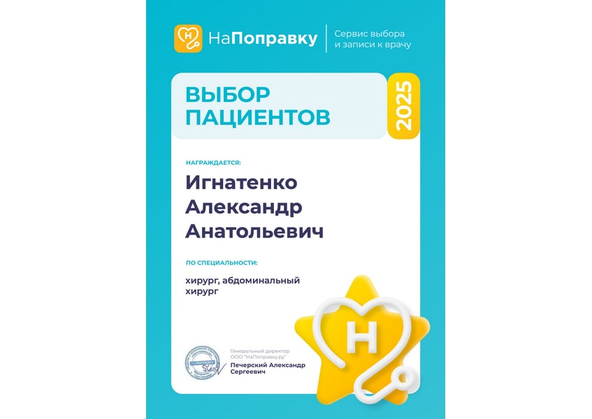 Добрый день! в декабре 2022 мы с мужем обратились к Игнатенко Александру Анатольевичу для консультации по удалению желчного пузыря и его последствий. От доктора получили исчерпывающую информацию, спасибо большое, и решили делать операцию. Переживаний в исходе операции не было т.к. доктор проявил понимание наших переживаний и развеял все наши страхи и сомнения. В первый же день были проведены необходимые обследования и взяты анализы, на следующий день проведена операция, оперировал сам Александр Анатольевич. После операции при обходе Александр Анатольевич, рассказал как необходимо вести себя в период реабилитации и на какие симптомы обратить внимание. После выписки не чувствовал никаких симптомов отсутствия желчного пузыря. Благодарю доктора и его команду сотрудников, все очень внимательны и добросовестны. Очень доволен, что выбрал эту клинику и доктора Александра Анатольевича Игнатенко.