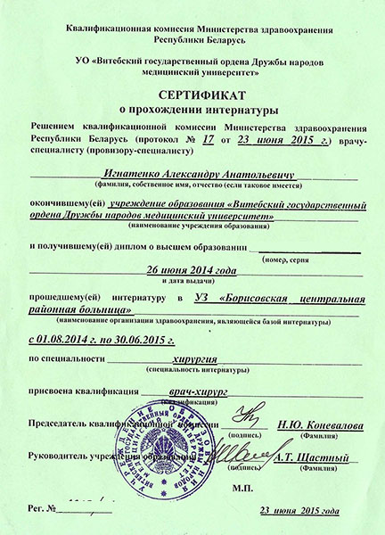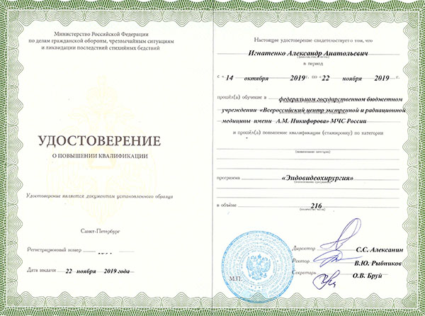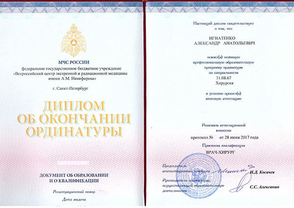 Игнатенко Александр Анатольевич в 2014 г. окончил Витебский Государственный Ордена дружбы народов медицинский университет, Республика Беларусь по специальности «Лечебное дело». С 2014 по 2015 гг. проходил интернатуру по специальности «Хирургия» на базе Борисовской ЦРБ, Республика Беларусь. С 2015 по 2017 гг. проходил учебу в клинической ординатуре по специальности «Хирургия» на кафедре хирургии и инновационных технологий ФГБУ ВЦЭРМ им. А.М. Никифорова МЧС России, СПб. C 2021 г. является руководителем центра хирургического лечения грыж живота на базе ОХЭП ВЦЭРМ им. А.М. Никифорова МЧС России.