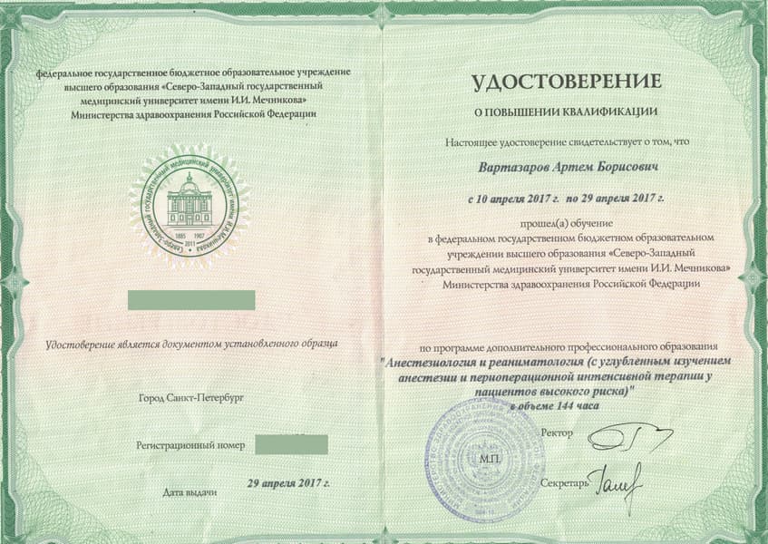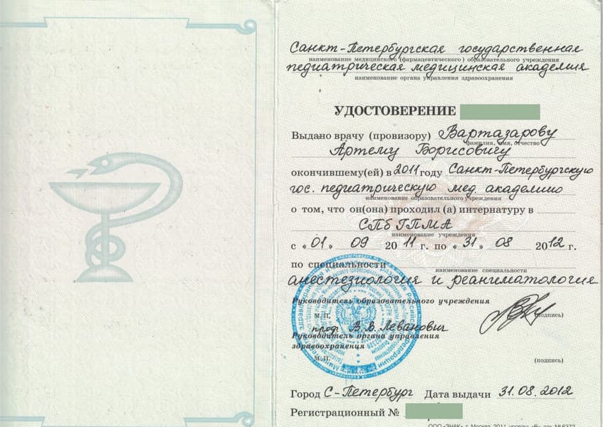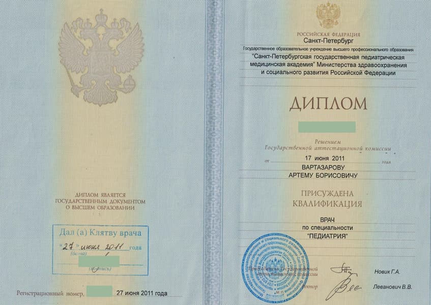 Вартазаров Артем Борисович в 2011 г. окончил Санкт-Петербургскую Педиатрическую медицинскую академию по специальности «Педиатрия». Там же в 2012 г. прошёл интернатуру по анестезиологии и реаниматологии.