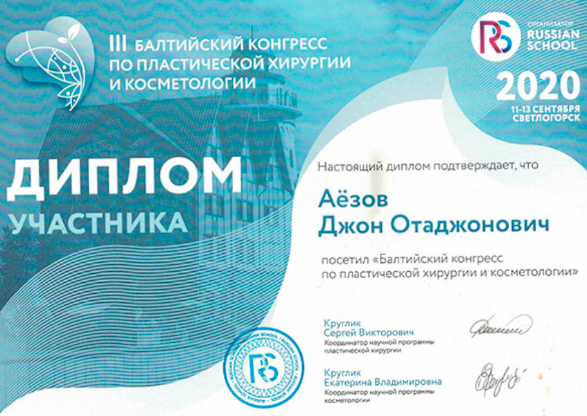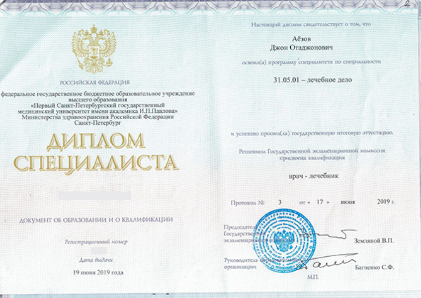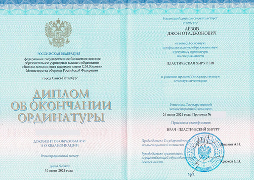 Джон Отаджонович закончил ФГБОУ ВО ПСПбГМУ имени И.П. Павлова в 2019 году по специальности «лечебное дело». Прошел ординатуру в Военно-медицинской академии имени С.М. Кирова по специальности «пластическая хирургия» в 2021 году.