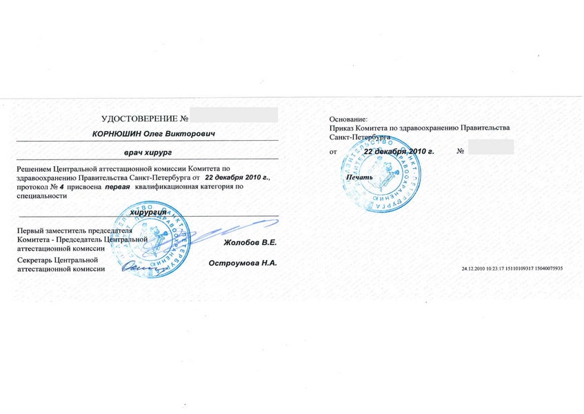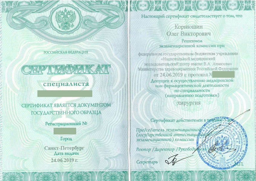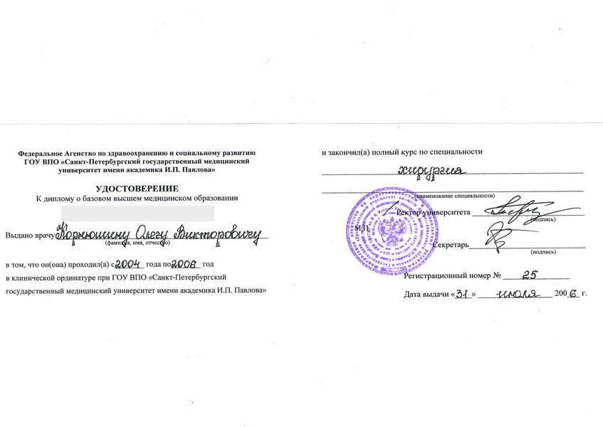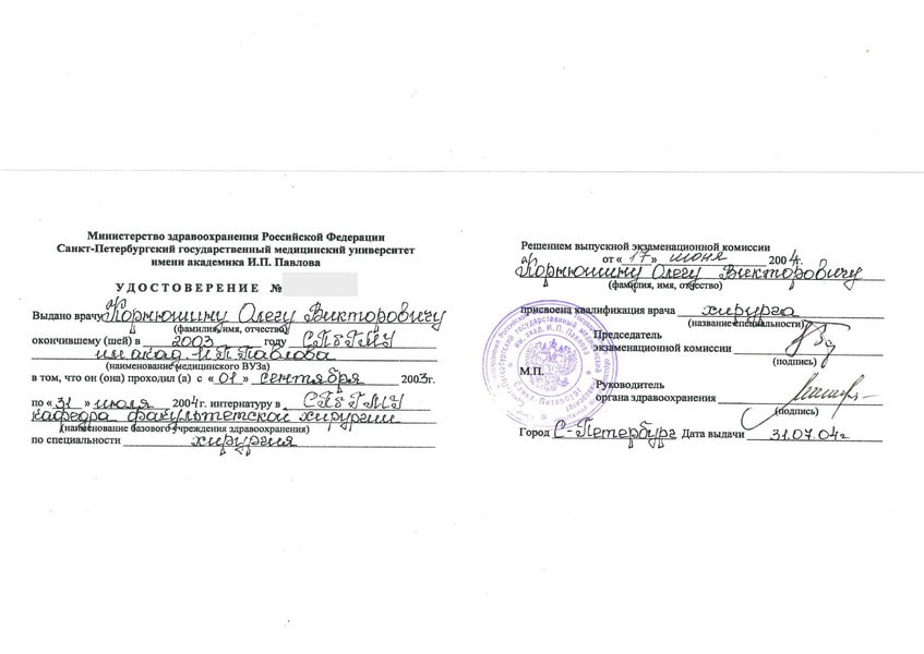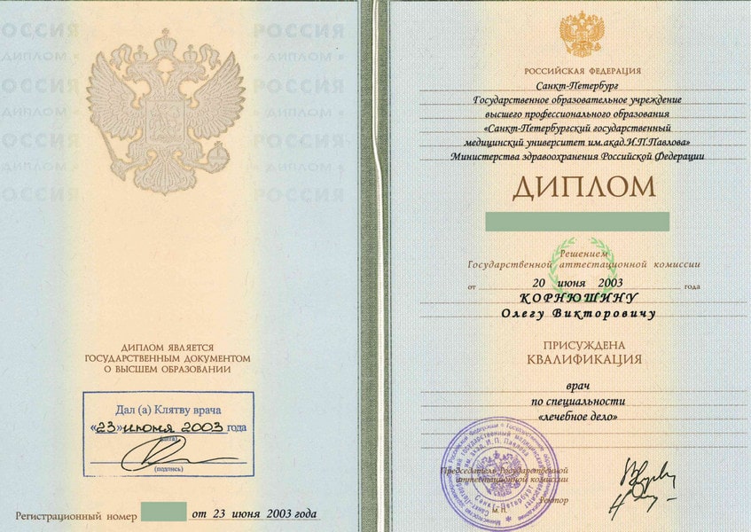 Корнюшин Олег Викторович окончил Санкт-Петербургский государственный медицинский университет им. акад. И.П. Павлова в 2003 г. Там же прошел интернатуру, клиническую ординатуру и аспирантуру по хирургии.