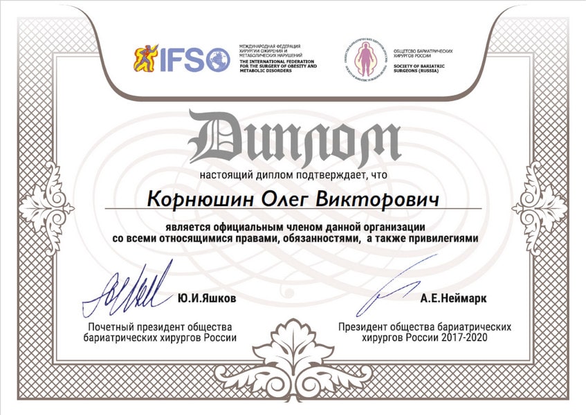 Олег Викторович состоит в Российском обществе бариатрических хирургов и Международной Федерации хирургии ожирения (IFSO). С 2014 года посещает ежегодные конгрессы, проводимые под эгидой Российского общества бариатрических хирургов. С 2016 - эксперт и постоянный участник обучающих семинаров, проводимых Российским обществом бариатрических хирургов.