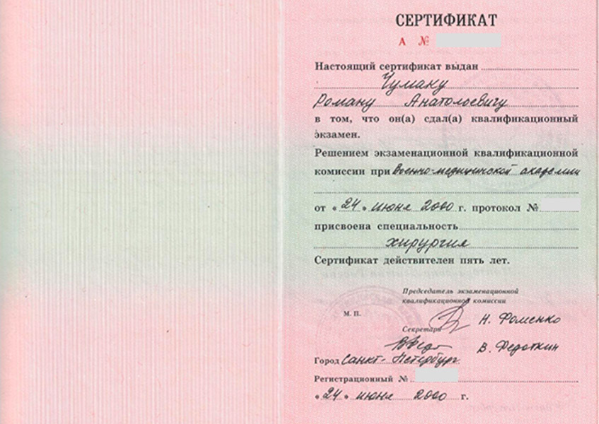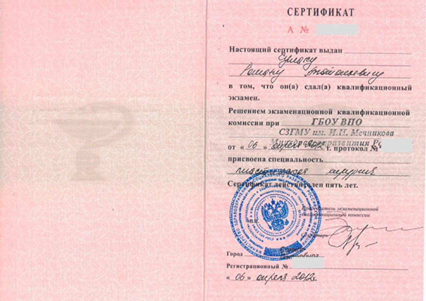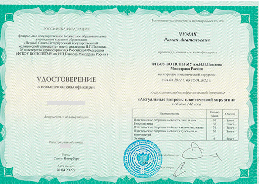 Прошел профессиональную переподготовку в ГБОУ ВПО СЗГМУ имени Мечникова по пластической хирургии.