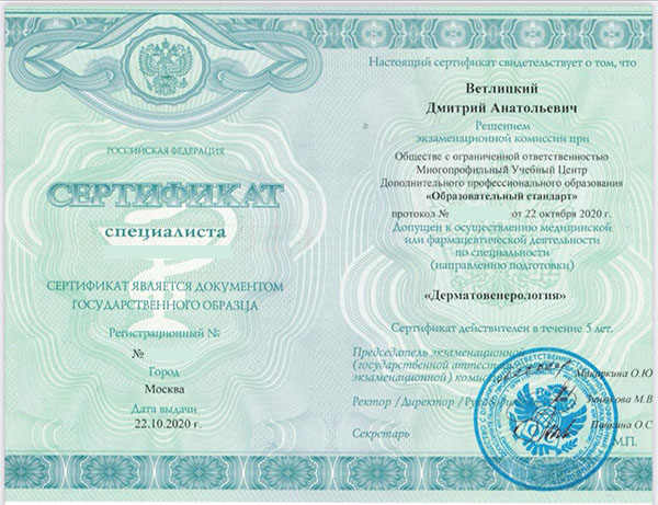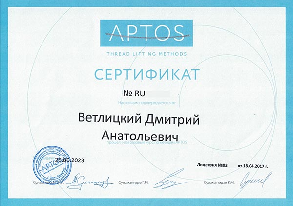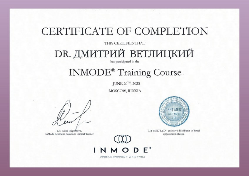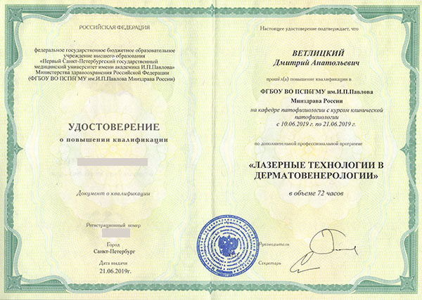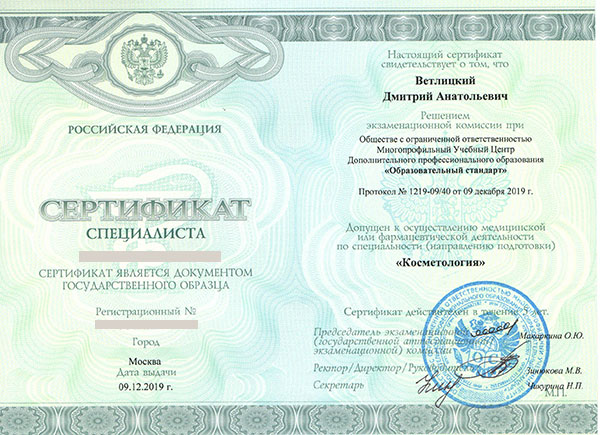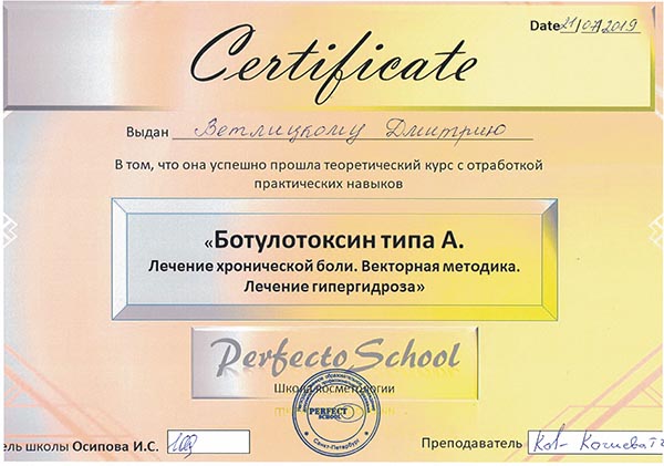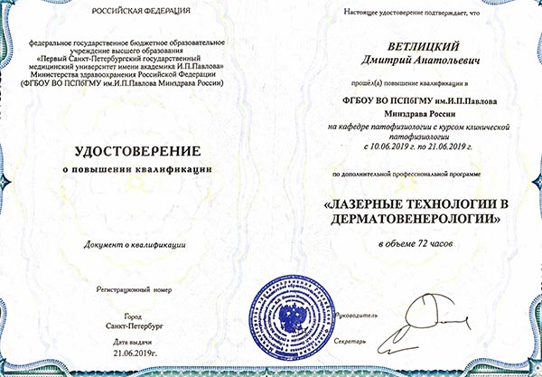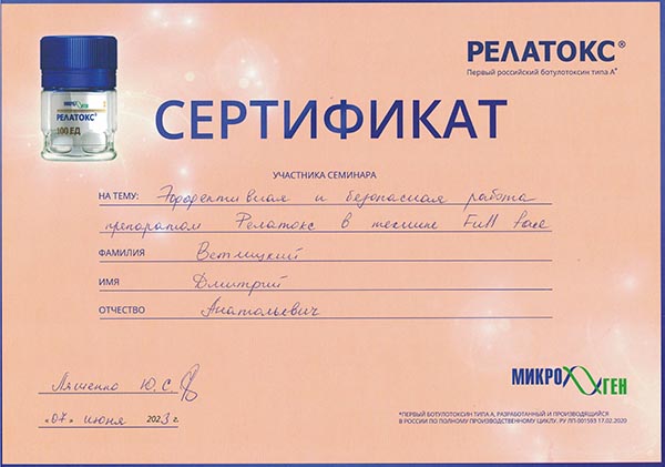 Дмитрий Анатольевич постоянно повышает свой профессиональный уровень. В числе последних повышений квалификации: «Косметология» 2024 год, «Основы дерматологии: теория и практика», «Радиоволновой метод деструкции новообразований кожи и слизистых», «Лазерные технологии в дерматологии», «Ботулотоксин в практике дерматокосметолога».