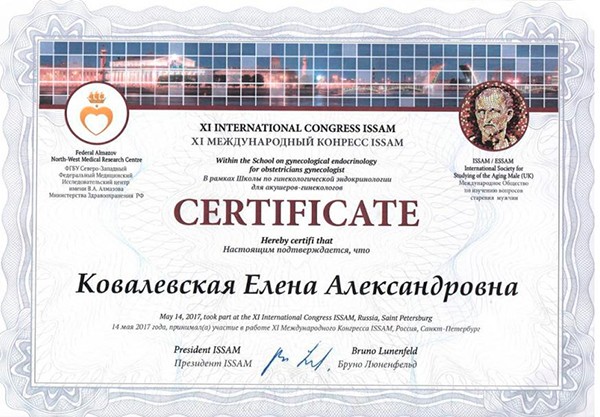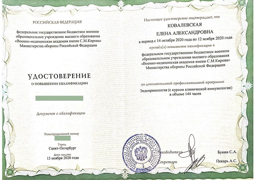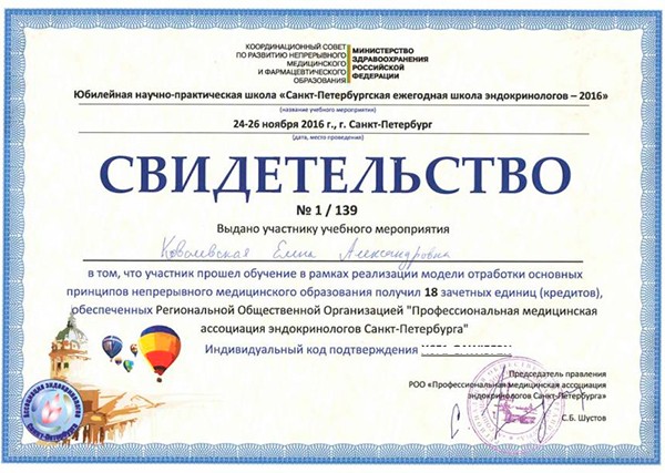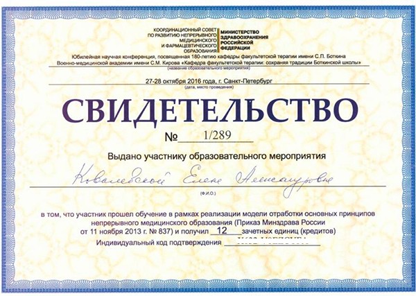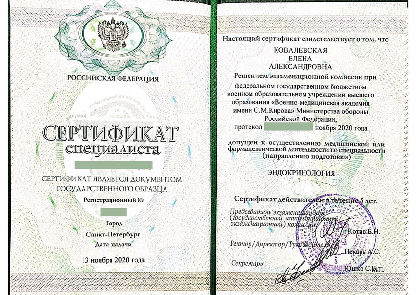 Ковалевская Елена Александровна - выпускница клинической ординатуры Петербургской государственной медицинской академии им. И.И. Мечникова. В течение 15 лет занимается Международными Клиническими исследованиями по протоколу GCP (в исследовании новых лекарственных препаратов для лечения сахарного диабета, ожирения, нарушений роста). В настоящий момент является ассистентом 1 кафедры терапии усовершенствования врачей Военно-Медицинской Академии им. С.М. Кирова.