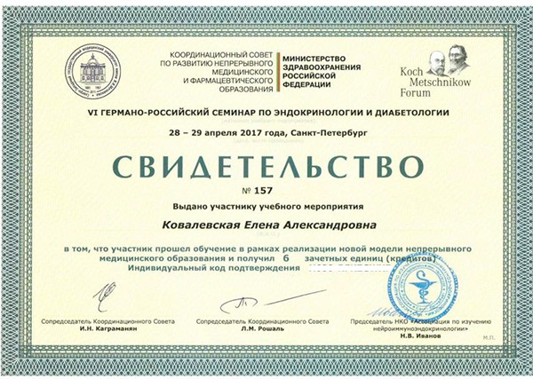 Хочу выразить благодарность Ковалевской Е.А. за то, что я прошла курс лечения под ее чутким контролем и в дальнейшем смогла родить малыша. Очень чуткий врач и специалист своего дела. С вопросами по эндокринологии теперь только к ней.