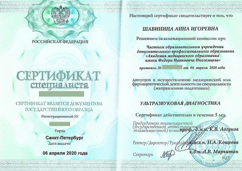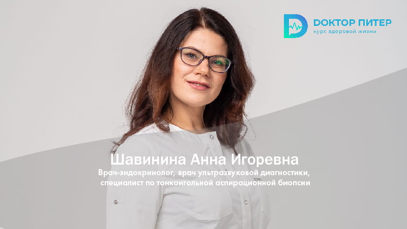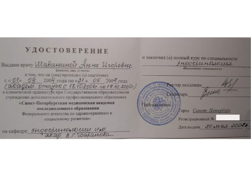 Шавинина Анна Игоревна в 2004 году окончила Санкт-Петербургскую медицинскую академию им. И.И. Мечникова. В 2004-2007 гг. проходила клиническую ординатуру по эндокринологии на базе Санкт-Петербургской медицинской академии последипломного образования. В 2011 году прошла первичную специализацию по ультразвуковой диагностике на базе СЗГМУ им. И.И. Мечникова.