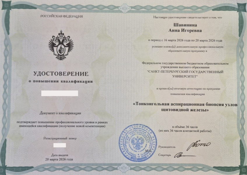 - 2026 - повышение квалификации «Тонкоигольная аспирационная биопсия узлов щитовидной железы» (Санкт-Петербургский государственный университет)