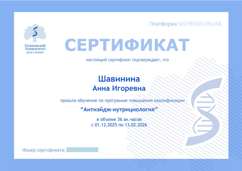 - 2026 - повышение квалификации «Антиэйдж-нутрициология» (ИПО ФГАОУ ВО Первый МГМУ им. И.М. Сеченова)