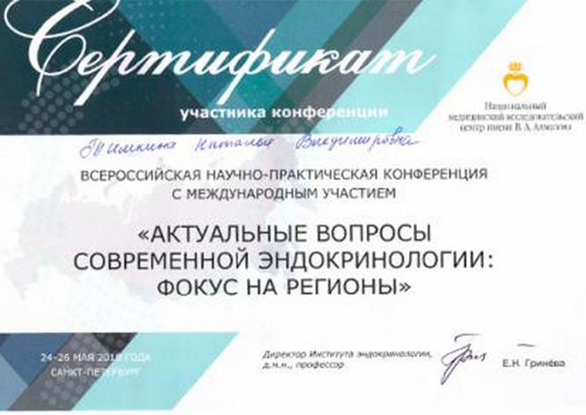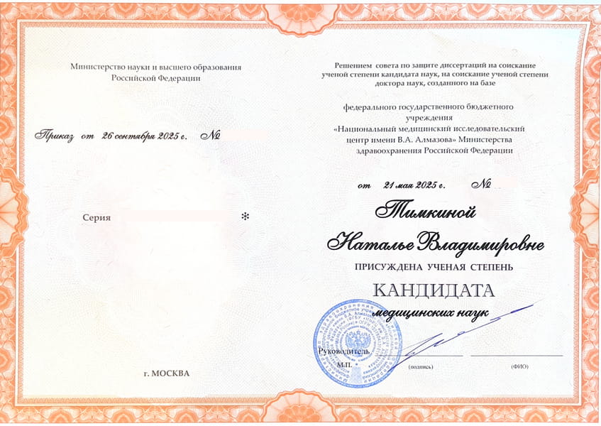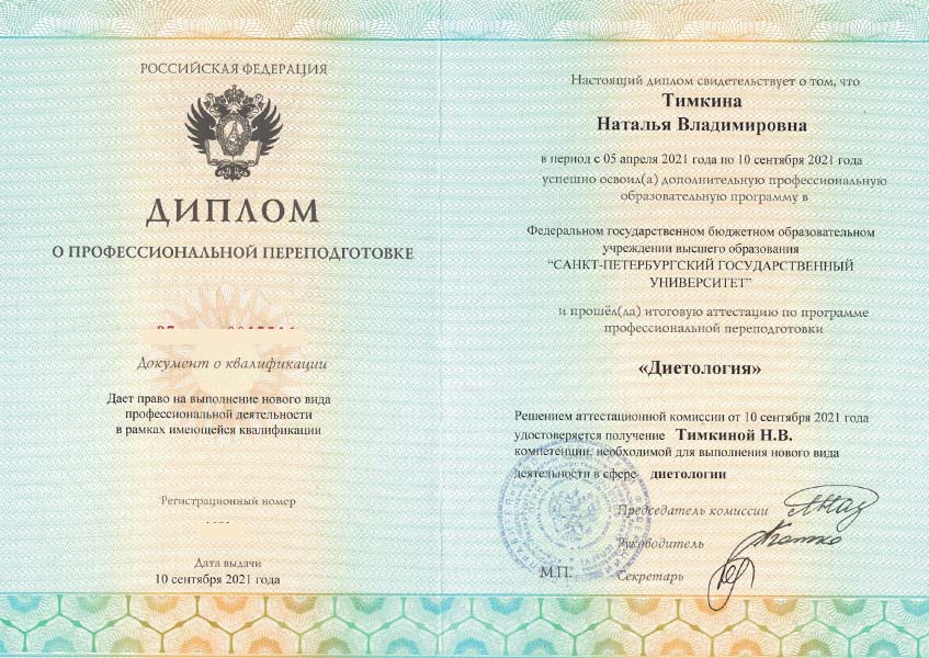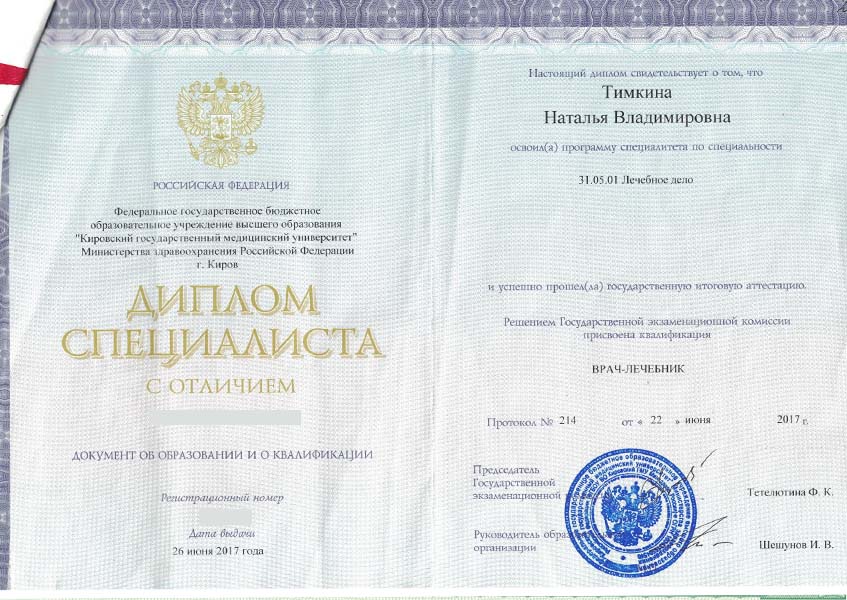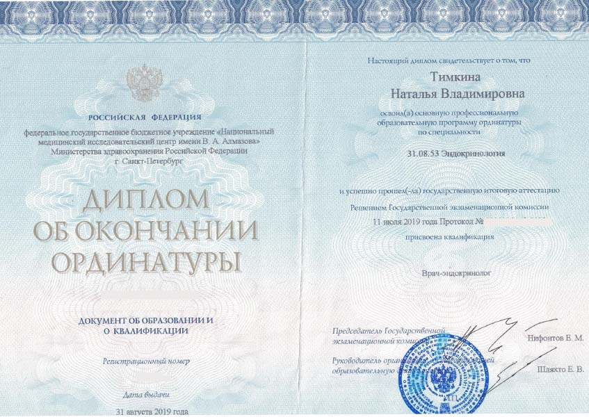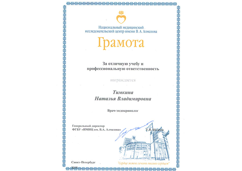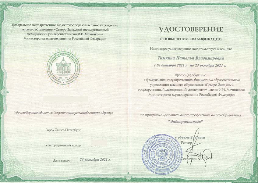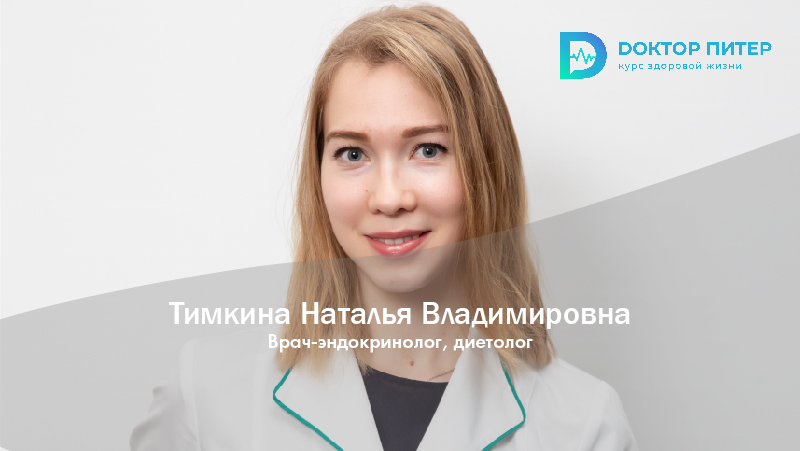 Тимкина Наталья Владимировна с отличием окончила Кировский государственный медицинский университет в 2017 году по специальности «Лечебное дело». В 2019 г. прошла ординатуру по специальности «Эндокринология» в ФБГУ НМИЦ им. В.А. Алмазова, отмечена грамотой за отличную учебу. В 2021 г. прошла повышение квалификации «Диетология» при СПбГУ.