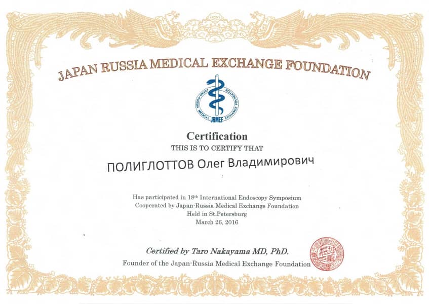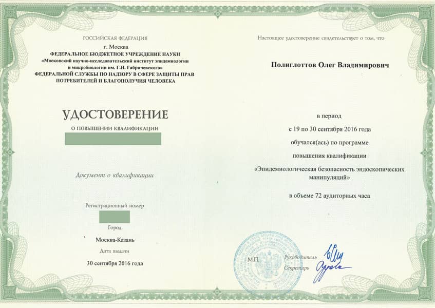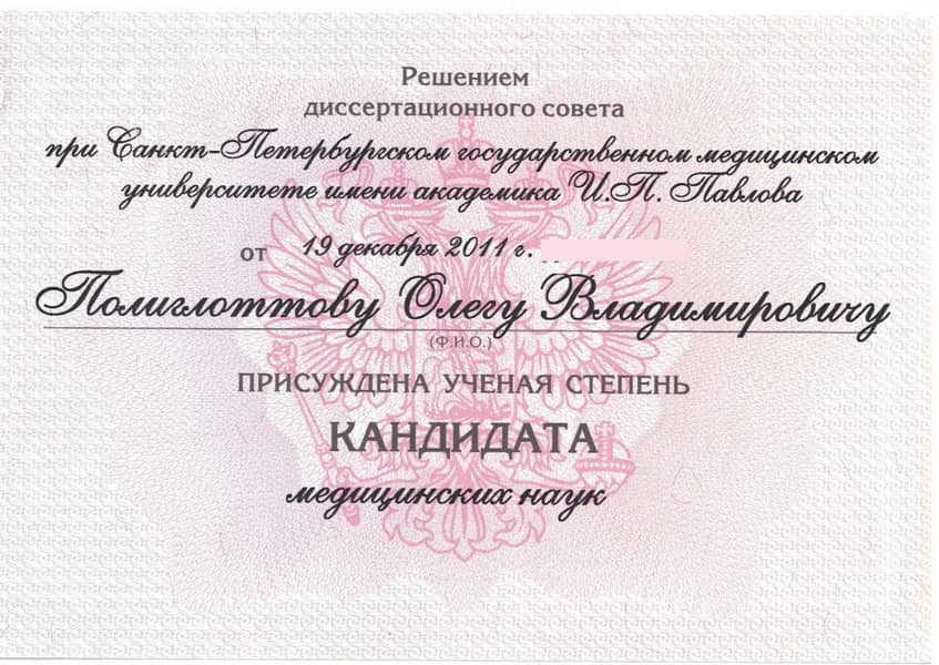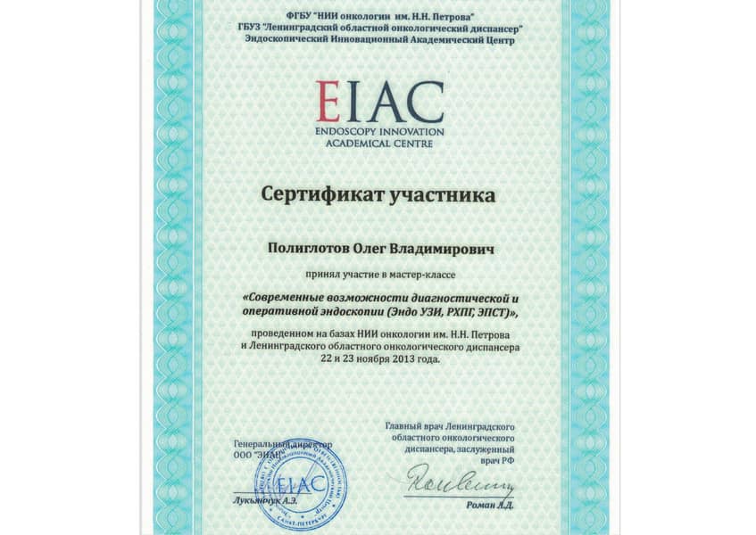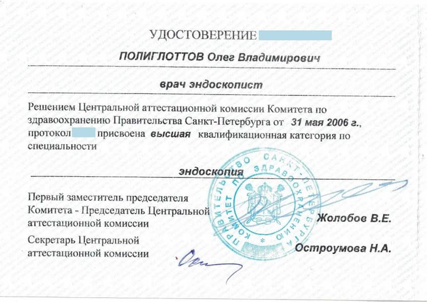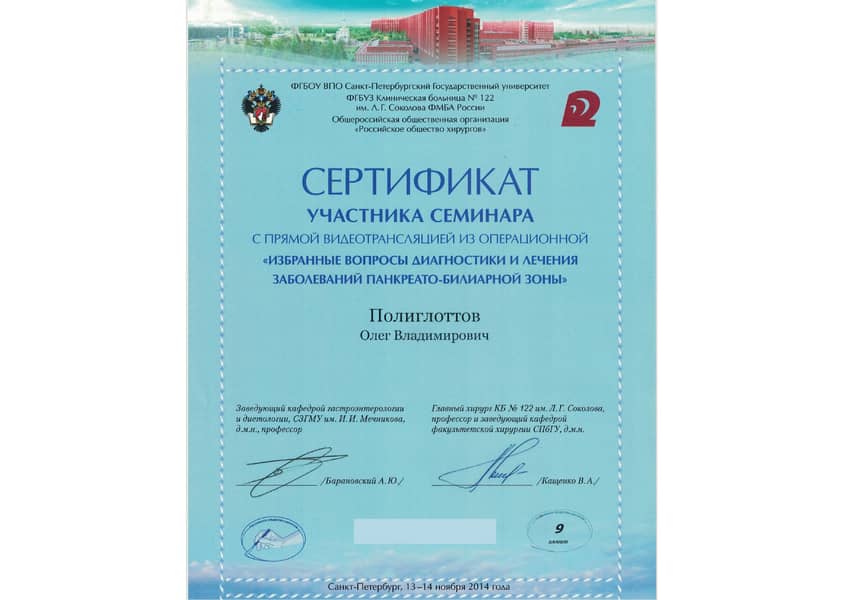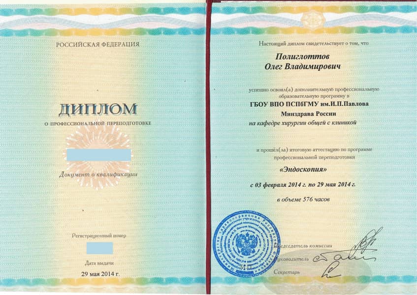 Полиглоттов Олег Владимирович с отличием окончил Санкт-Петербургский медицинский институт им. акад. И.П. Павлова по специальности «Лечебное дело» в 1992 году. Там же в 1993 г. прошёл интернатуру по хирургии (с первичной специализацией по эндоскопии). В 2004 г. стажировался в Медицинском университете г. Ниигата (Япония). С 2011 г. кандидат медицинских наук. Прошёл профессиональную переподготовку и сертификационный курс по специальности «Эндоскопия» в 2014 и 2019 гг.
