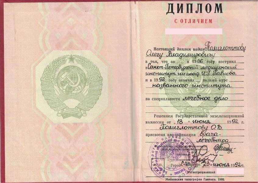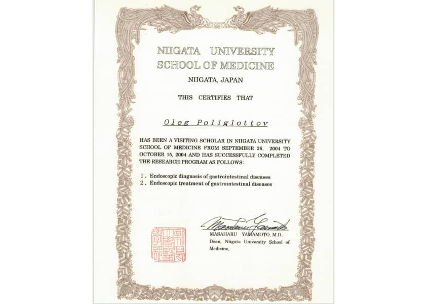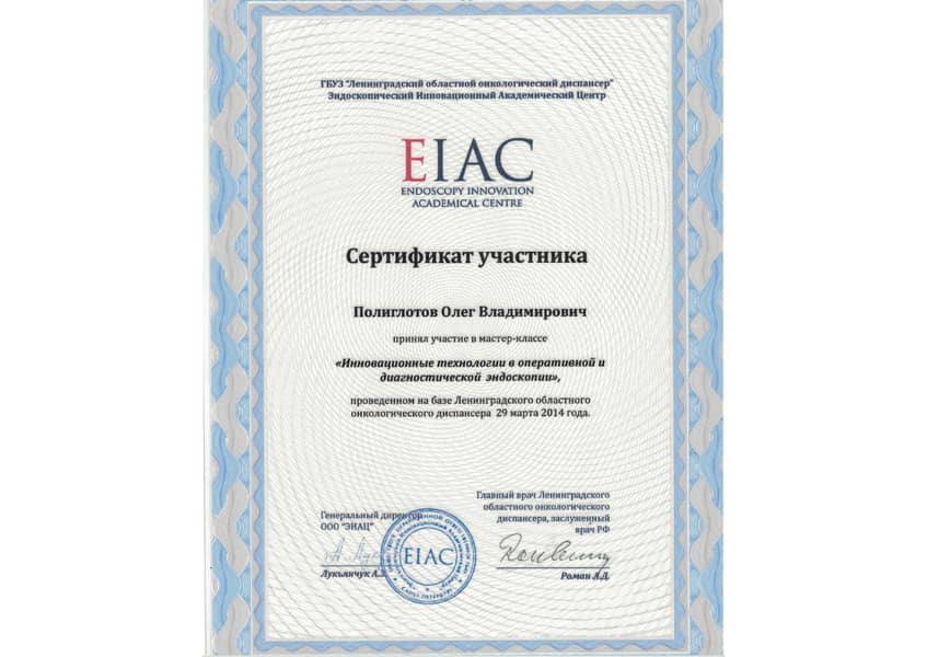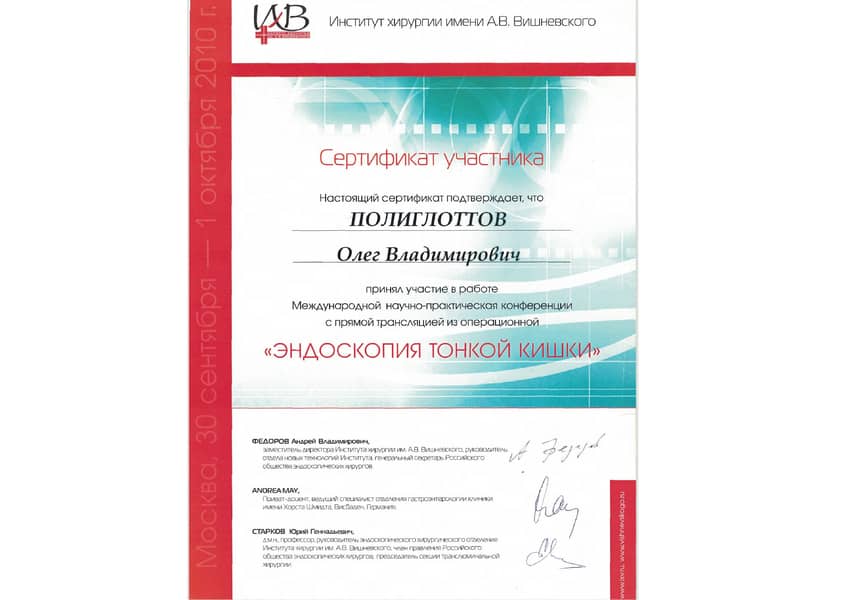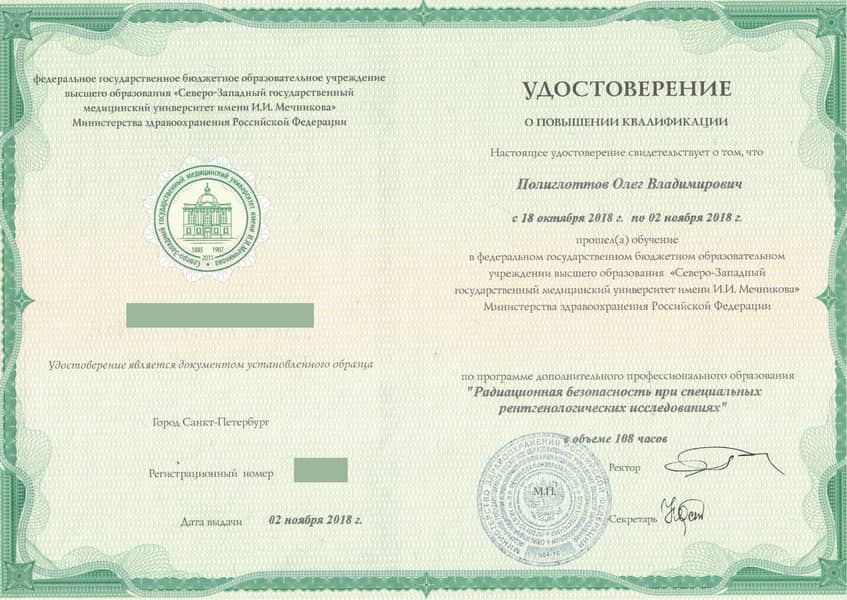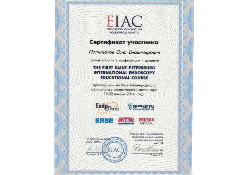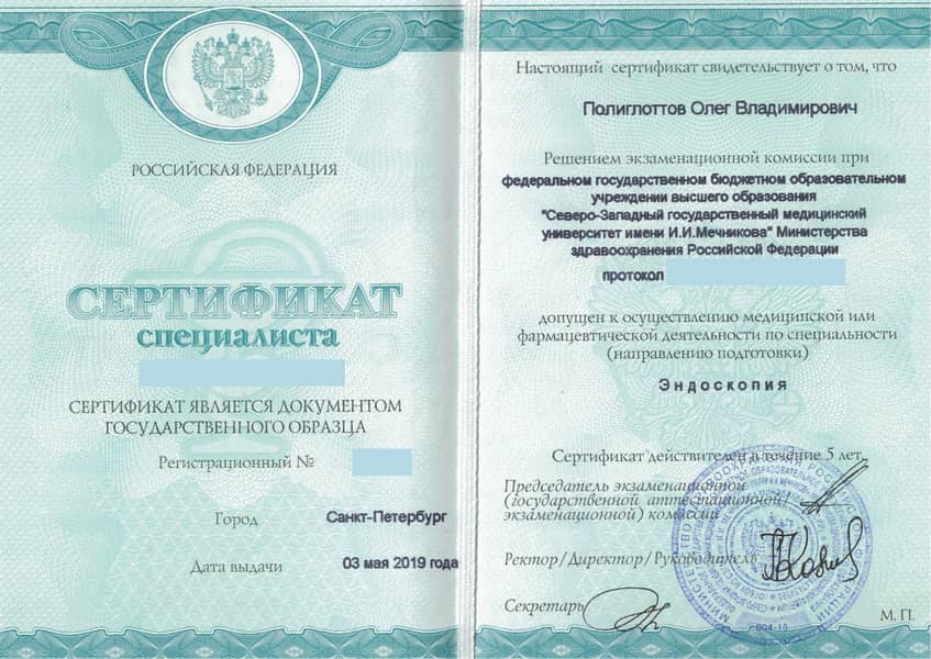 Полиглоттов Олег Владимирович с отличием окончил Санкт-Петербургский медицинский институт им. акад. И.П. Павлова по специальности «Лечебное дело» в 1992 году. Там же в 1993 г. прошёл интернатуру по хирургии (с первичной специализацией по эндоскопии). В 2004 г. стажировался в Медицинском университете г. Ниигата (Япония). С 2011 г. кандидат медицинских наук. Прошёл профессиональную переподготовку и сертификационный курс по специальности «Эндоскопия» в 2014 и 2019 гг.