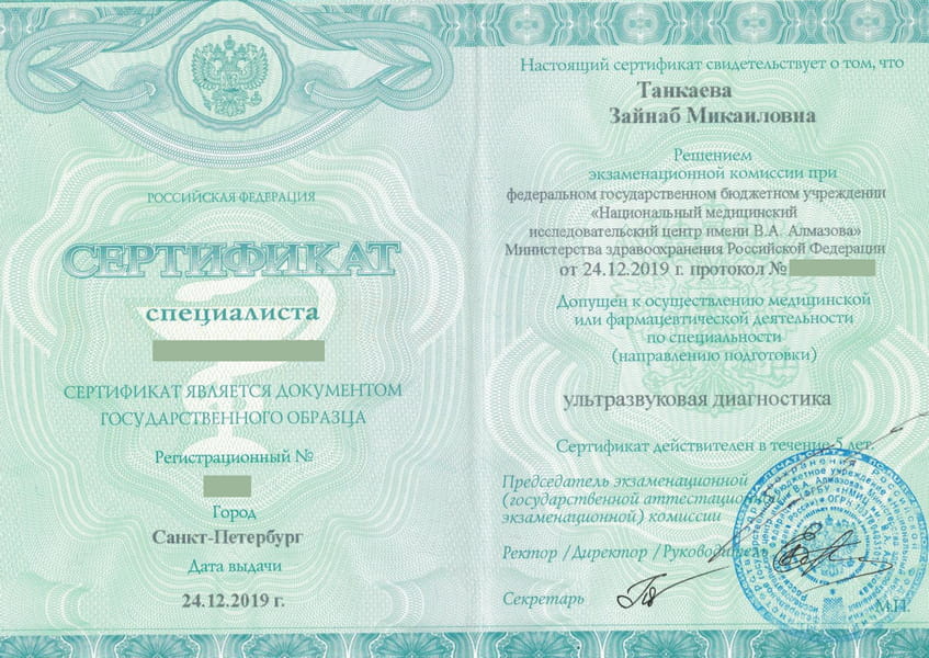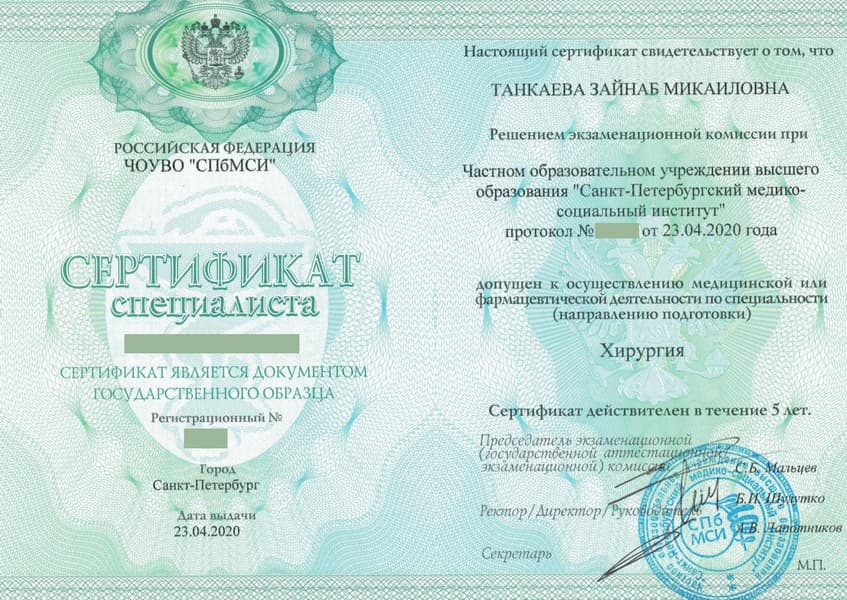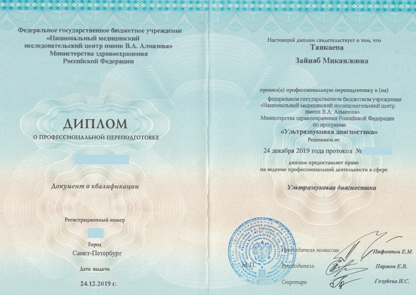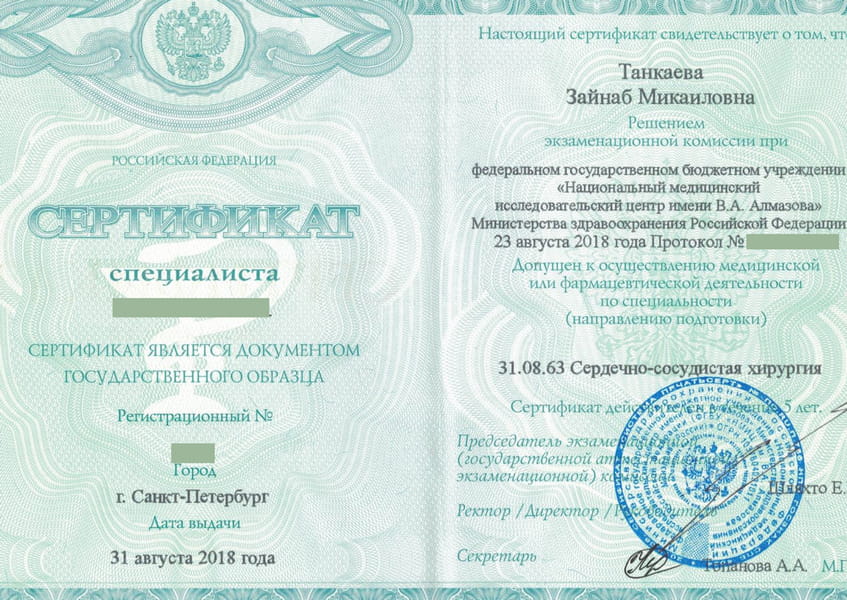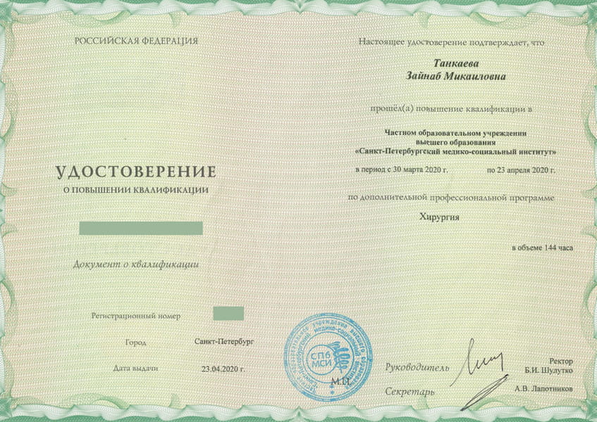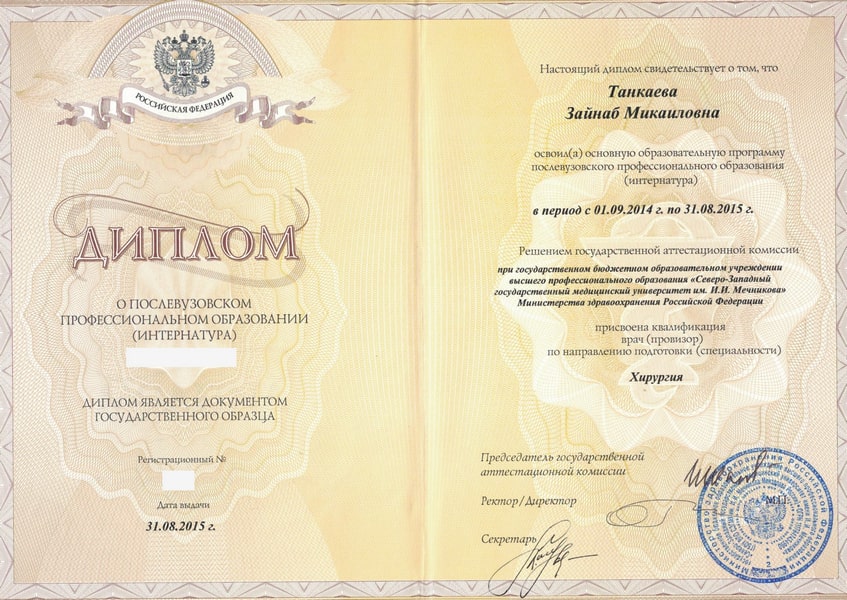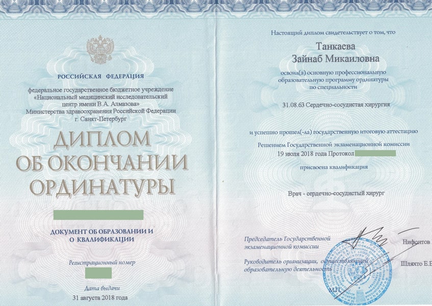 Танкаева Зайнаб Микаиловна в 2014 г. окончила Рязанский государственный медицинский университет имени академика И.П. Павлова. В 2015 - интернатуру по хирургии в Северо-Западном государственном медицинском университете имени И.И. Мечникова, в 2018 - ординатуру по сердечно-сосудистой хирургии в Национальном Медицинском Исследовательском Центре им. В.А. Алмазова.