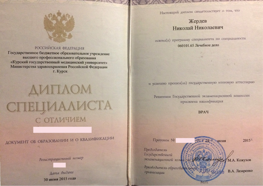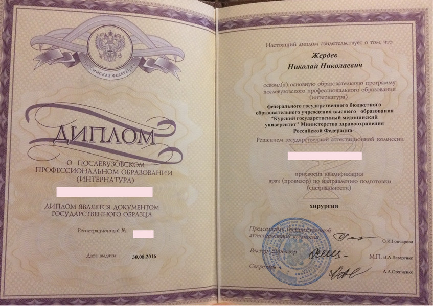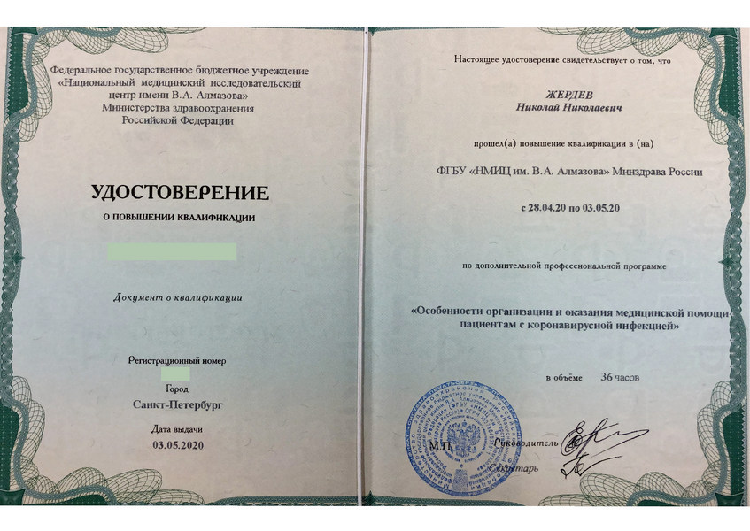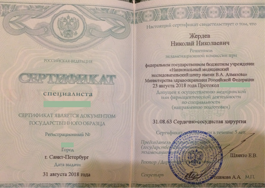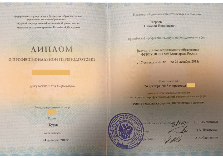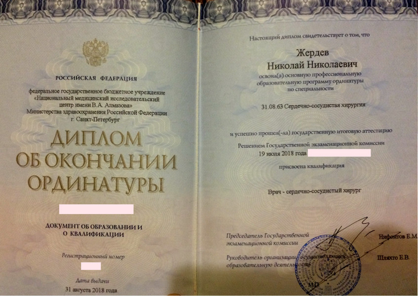 Жердев Николай Николаевич окончил Курский государственный медицинский университет по специальности «Лечебное дело» в 2015 году. Там же прошел интернатуру по «Хирургии» в 2016 г. Обучение в ординатуре при НМИЦ им. В. А. Алмазова, по специальности «Сердечно-сосудистая хирургия» - 2018 г. Повышение квалификации: Курский государственный медицинский университет - «Рентгенохирургические методы диагностики и лечения» в 2018 г.