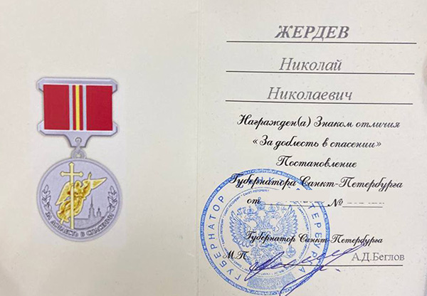 Награжден знаком отличия от губернатора Санкт-Петербурга «За доблесть в спасении» за проявленное мужество и самоотверженность при исполнении служебного долга при спасении жизней и здоровья людей.