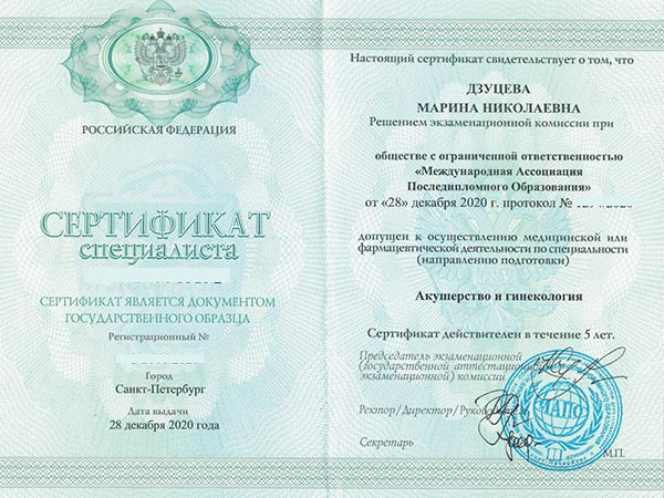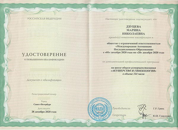 Дзуцева Марина Николаевна имеет опыт работы в акушерстве и гинекологии с 1989 года, имеет дополнительную специализацию по УЗИ.