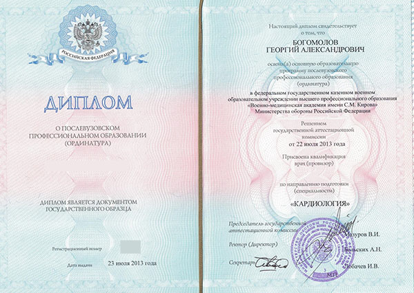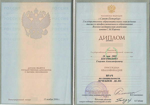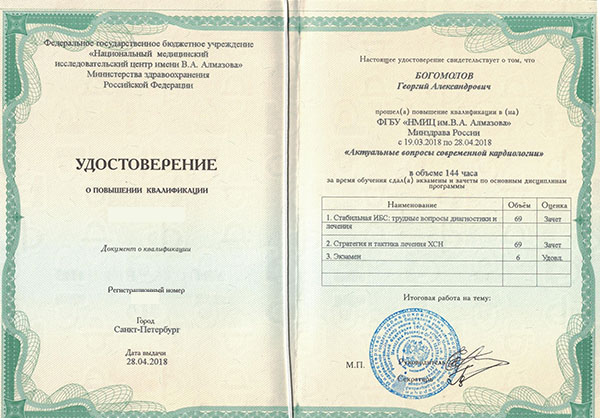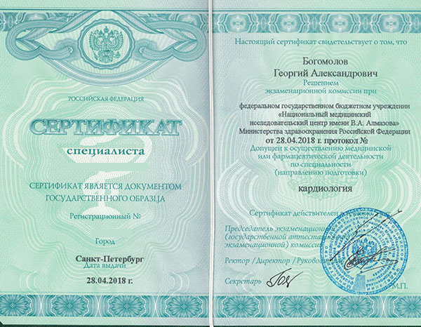 Богомолов Георгий Александрович в 2005 году успешно окончил Военно-Медицинскую Академию им. С.М. Кирова. В 2006 году закончил интернатуру по специальности «Врач общей практики». Далее окончил с отличием ординатуру по кардиологии на базе ТУВ-1 Военно-Медицинской Академии.