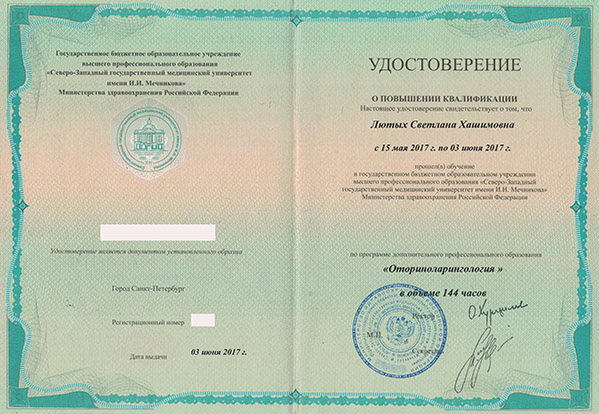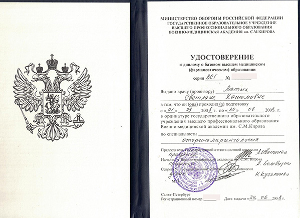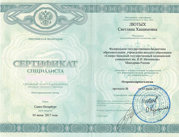 Лютых Светлана Хашимовна окончила Ростовский государственный медицинский университет в 2006 году, педиатрический факультет. В 2008 году – ординатуру по специальности «Оториноларингология» в Военно-медицинской академии им. С.М. Кирова. Стажировалась в Санкт-Петербургской академии по детской оториноларингологии. В 2008 г. повышала квалификацию в Санкт-Петербургской государственной академии им И.И. Мечникова по программе «Актуальные проблемы профпатологии, медико-социальная экспертиза при профзаболеваниях». Участник семинара по микрохирургии уха в Институте оториноларингологии в г. Киев, Украина.