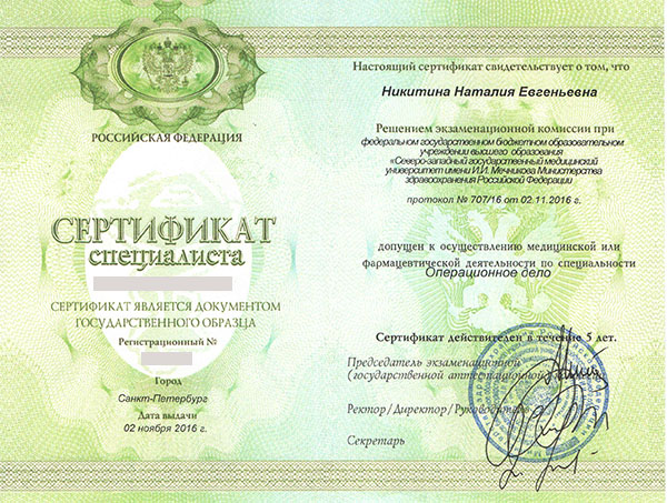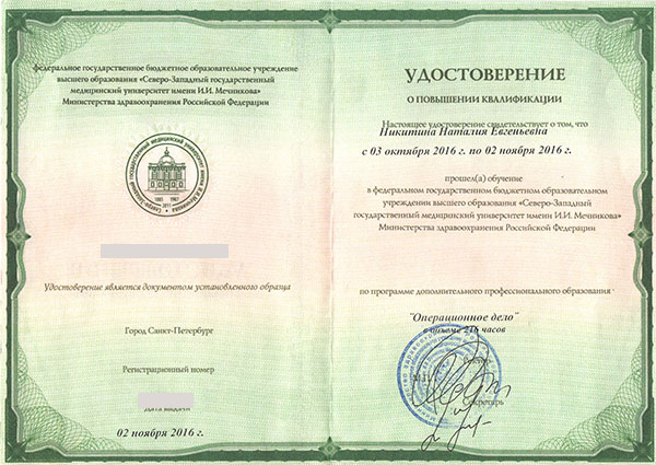 В 2016 году прошла очередное повышение квалификации в СЗГМУ им. И.И. Мечникова по специальности "Операционное дело".
