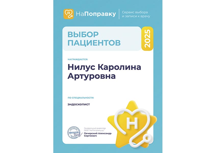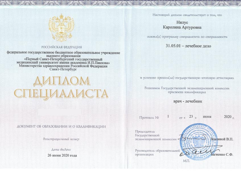 Нилус Каролина Артуровна в 2020 году окончила ПСПБГМУ имени академика И.П. Павлова по специальности «Лечебное дело», там же в 2020 году прошла ординатуру по специальности «Эндоскопия».