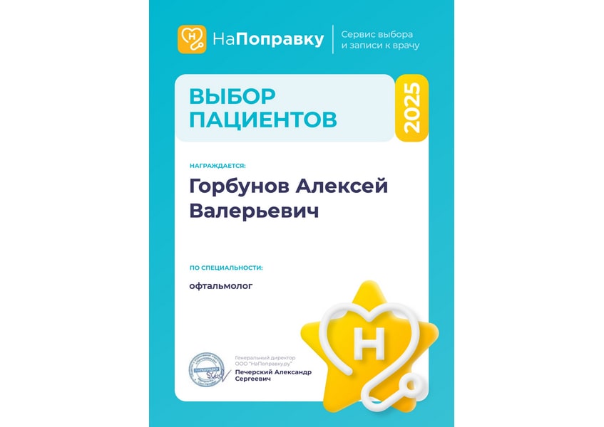 Врача Горбунова А.В. выбрала по отзывам, стажу работы и квалификации, о чём ни разу не пожалела. Обратилась в июне с сильной миопией для проверки состояния глаз, сетчатки и т. д., так как уже несколько лет не проверяла глаза. Такого тщательного осмотра офтальмолога у меня ещё не было. Врач максимально спокоен, тактичен, никуда не спешит при осмотре, дотошно (в самом хорошем смысле) и тщательно выполняет осмотр различными методами диагностики, всё подробно объясняет и отвечает на возникающие вопросы. С первых минут приёма отметила высокий профессионализм врача. Были даны рекомендации по снятию спазма в глазных яблоках и синдрома сухого глаза. Эффективность лечения оценить не могу, так как ничего особо не беспокоит. Обязательно обращусь ещё для плановых проверок.