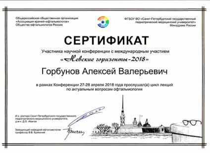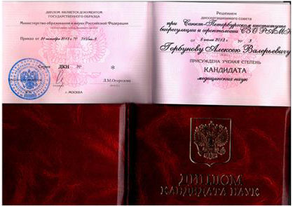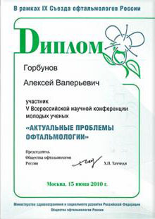 Горбунов Алексей Валерьевич окончил лечебный факультет Самарского Государственного медицинского университета по специальности “лечебное дело“ в 2006 году. Клиническую ординатуру прошёл на кафедре офтальмологии СПбГМА им. И.И.Мечникова (2008 г), аспирантуру по специальностям «офтальмология» и «геронтология» на кафедре СПб ИБГ СЗО РАМН (2008-2013 гг). Защитил кандидатскую диссертацию по вопросам современных методик диагностики и лечения возрастной макулярной дегенерации (2013 г).
