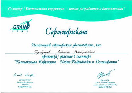 Прошел сертификационные курсы и повышение квалификации по детской офтальмологии, профпатологии, контактной коррекции зрения, когерентной томографии и патологии макулы, компьютерной периметрии в офтальмологии.