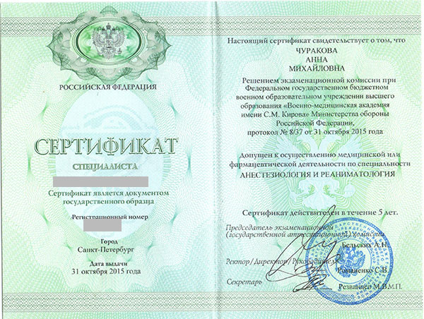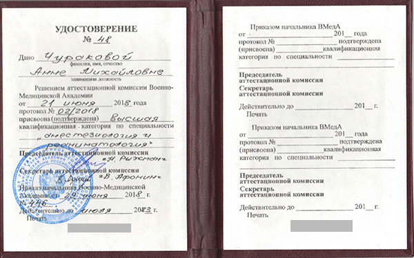 Чуракова Анна Михайловна в 2006 году окончила ГОУ ВПО ВМА им. С.М. Кирова медицинский колледж по специальности "Сестринское дело". В 2015 году при ВМА им. С.М. Кирова прошла повышение квалификации по специальности "Анестезиология и реаниматология". В 2018 году подтвердила высшую категорию в анестезиологии и реаниматологии.