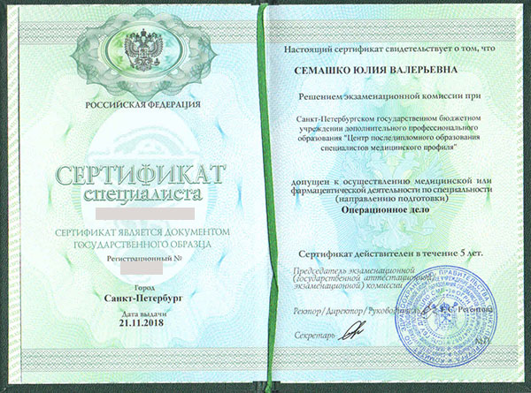 В 2018 году прошла очередное повышение квалификации по специальности "Операционное дело".
