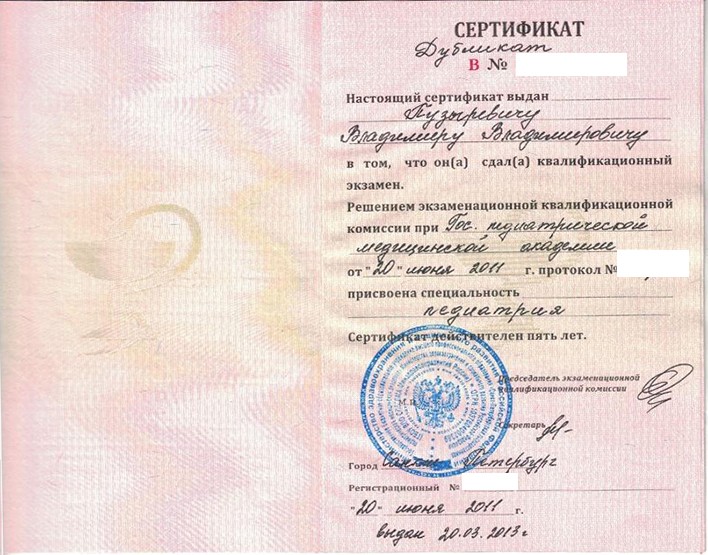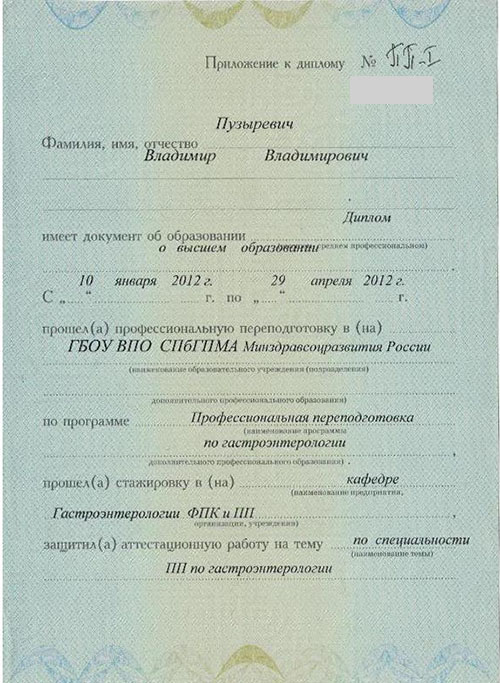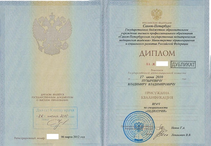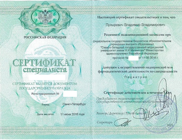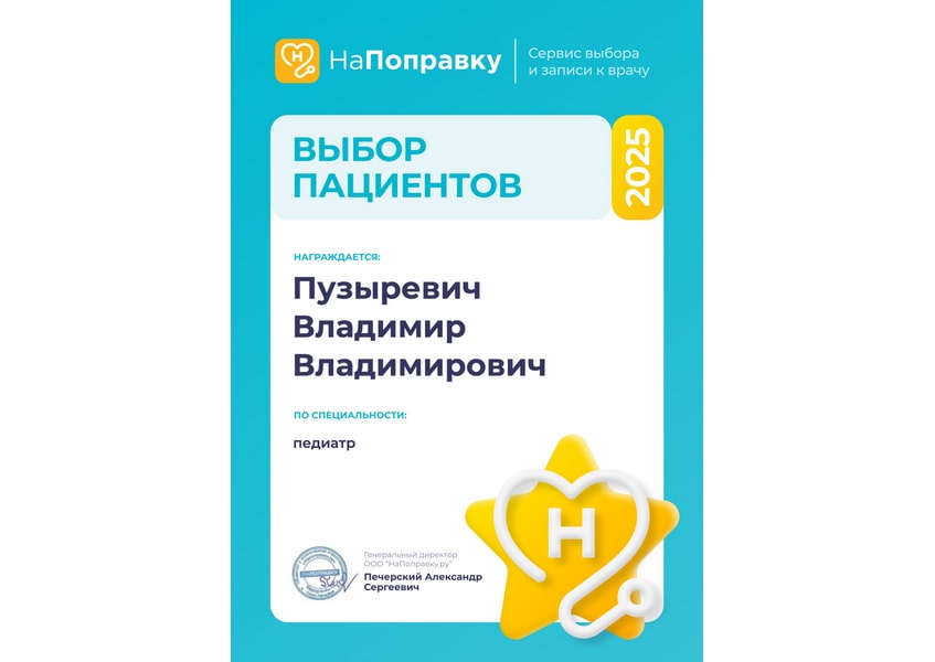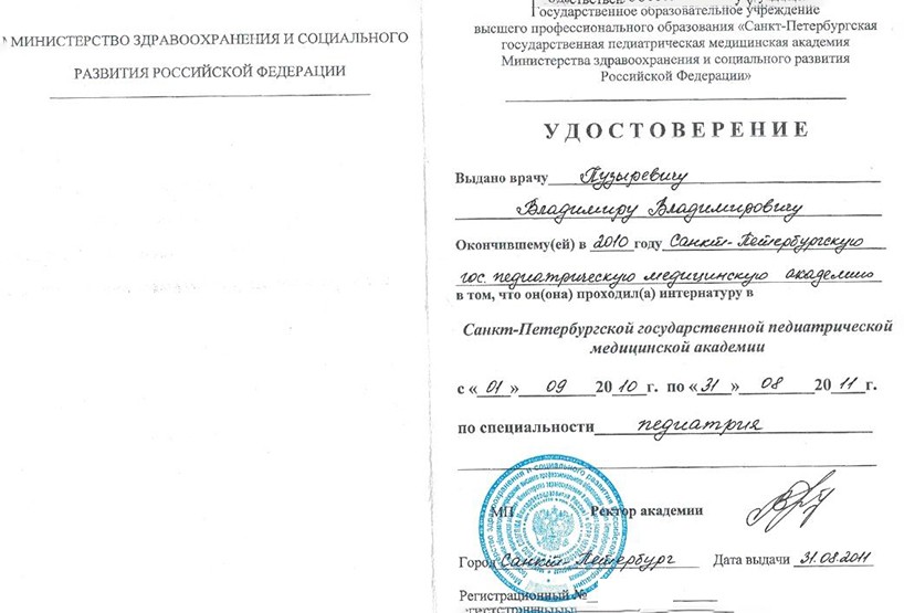 Пузыревич Владимир Владимирович в 2010 году окончил государственную педиатрическую медицинскую Академию по специальности «Педиатрия». Интернатуру в 2011 г. проходил при Детской городской клинической больнице № 5 имени Н.Ф. Филатова, где получил широкий практический навык работы с детьми.