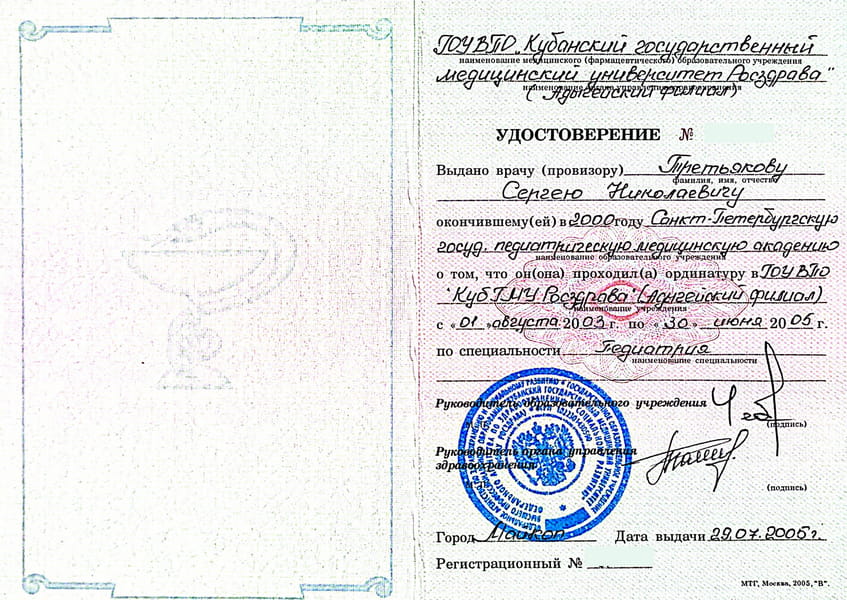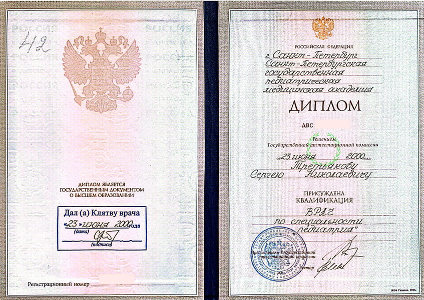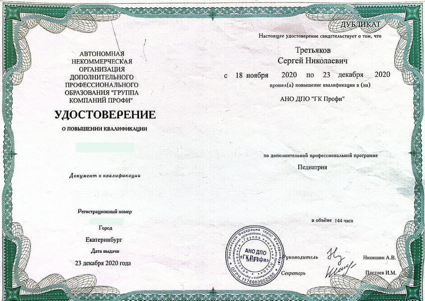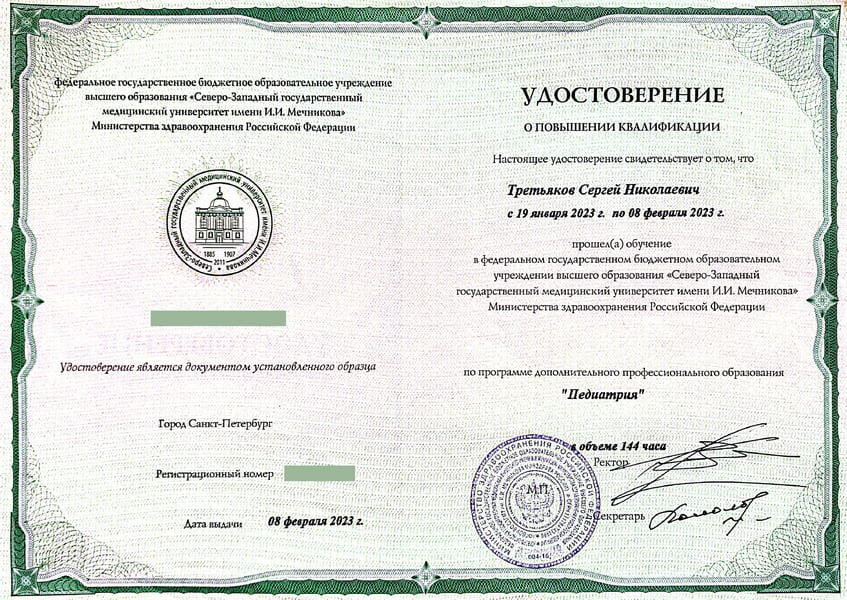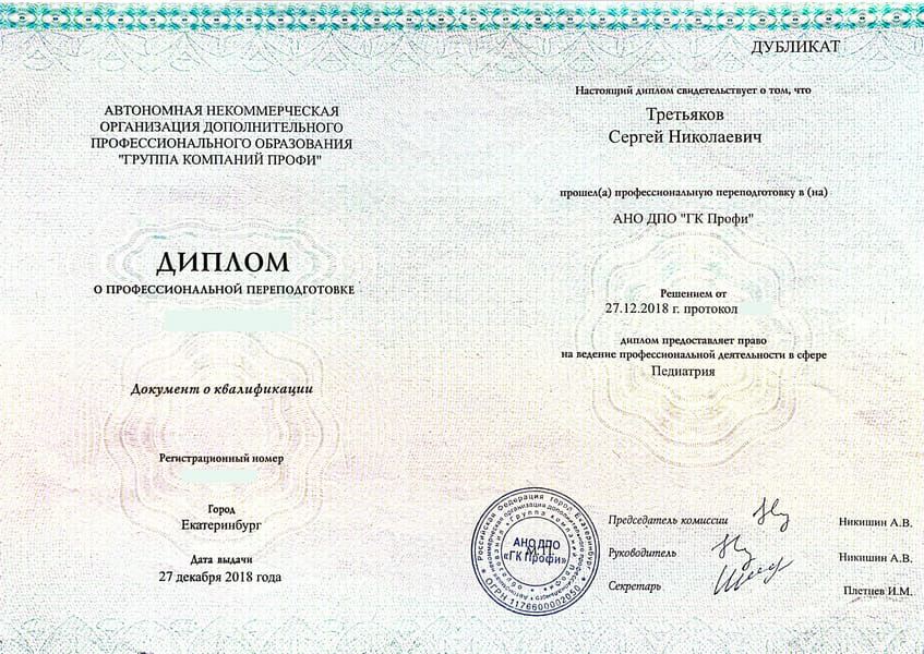 Третьяков Сергей Николаевич окончил Санкт-Петербургскую Государственную педиатрическую медицинскую академию в 2000 г. Ординатуру по специальности «Педиатрия» прошёл в Адыгейском филиале ГОУВПО «Кубанский Государственный медицинский университет Росздрава» в 2005 г.