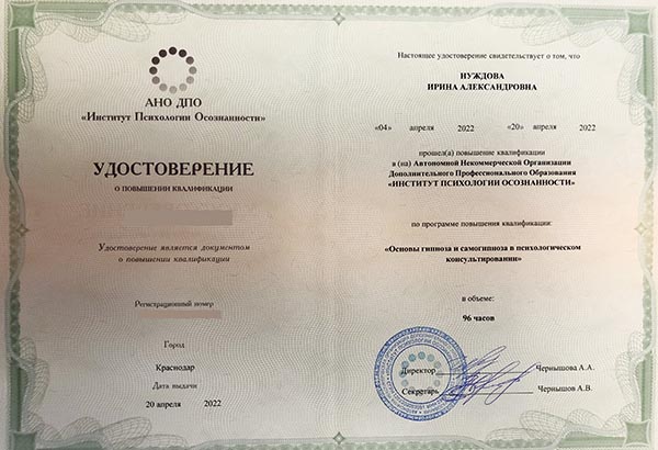 | Сессия гипнотерапии с регрессией (возрастная или в прошлые жизни), (2,5 часа), Нуждова И.А. | 20000 |