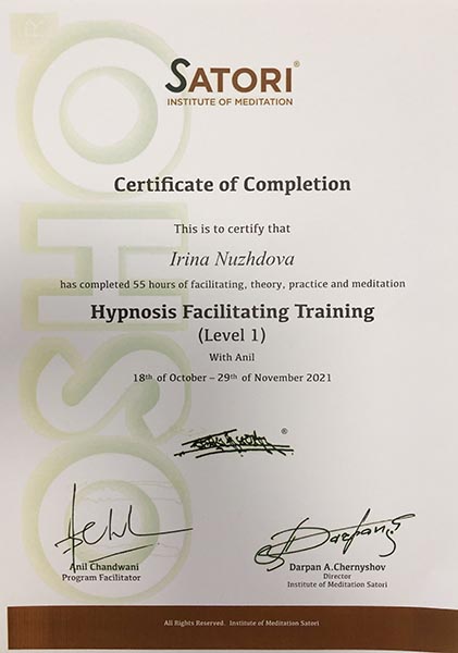 Является сертифицированным ведущим медитативной терапии «Разговор ТелаУма», ведущим активных и ведомых медитаций (сертификаты международного образца).