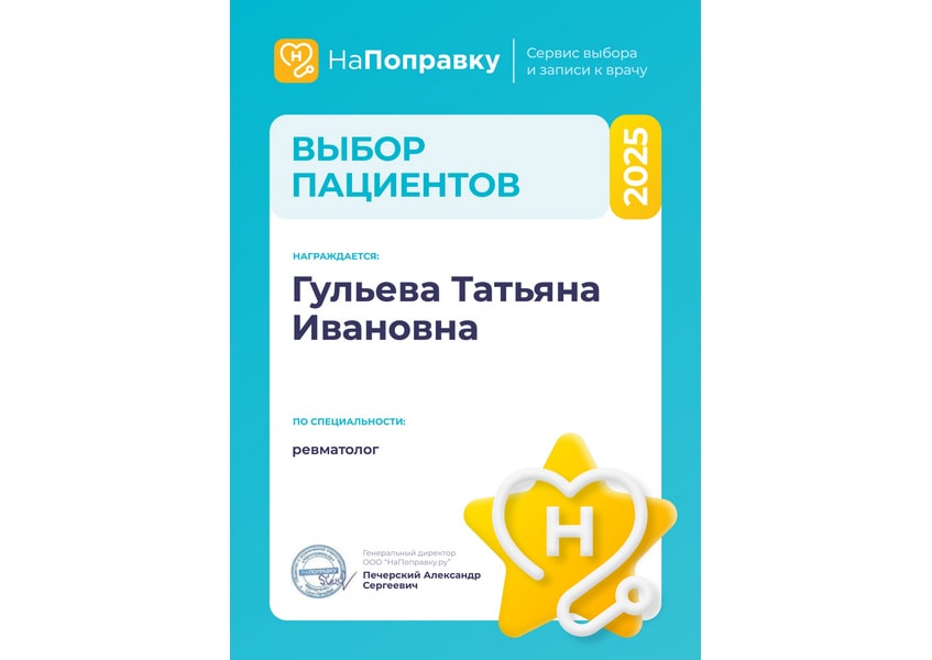 Гульева Татьяна Ивановна - одна из самых внимательных врачей из тех, кого я встречала (а у меня толстая медицинская папка). Первичный приём реально длился час и это, ВНИМАНИЕ, первый доктор на моей памяти, которая действительно собрала АНАМНЕЗ, т.е. спрашивала обо всех болячках, вмешательствах и исследованиях. Раньше я брала к докторам свою толстую мед.папку и всем было по-барабану. А она спрашивала, что я с собой принесла. У меня на тот момент только записи в портале "Здоровье петербуржца" от Госуслуг была хоть какая-то инфа, я зашла туда, так она реально взяла мой телефон и стала изучать внимательно предыдущие анализы крови и т.п.