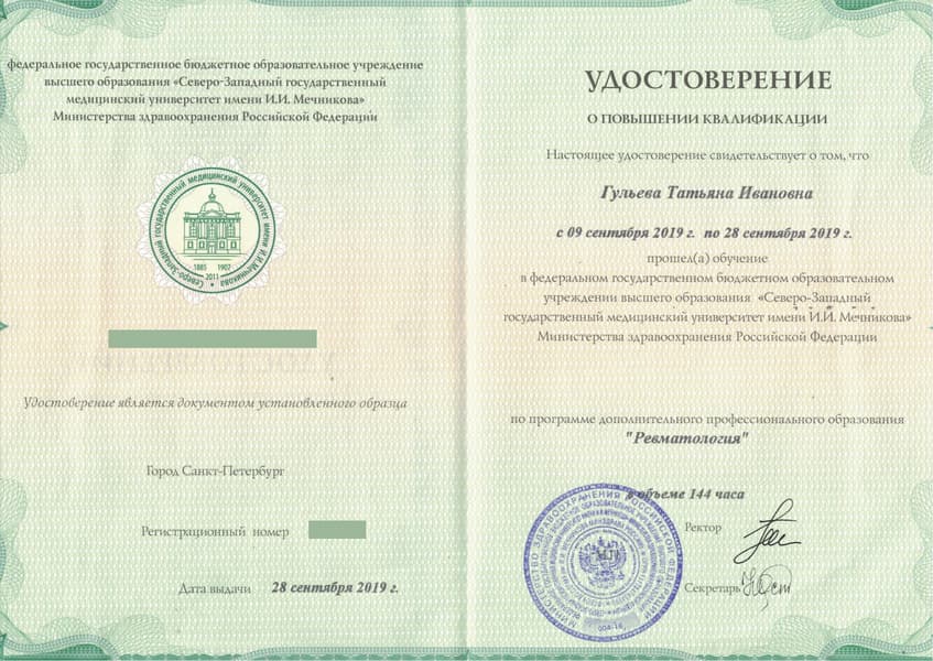 Гульева Татьяна Ивановна регулярно участвует в профессиональных мероприятиях, таких как Ежегодная научно-практическая конференция ФГБНУ НИИР им. В.А. Насоновой и Ежегодная научно-практическая конференция «Проблемы современной ревматологии». Состоит в Обществе ревматологов Санкт-Петербурга. Постоянно проходит обучения и повышения квалификации, семинары, тренинги, вебинары. Выступает перед терапевтами в поликлиниках с целью обучения и улучшения преемственности в работе с пациентами.