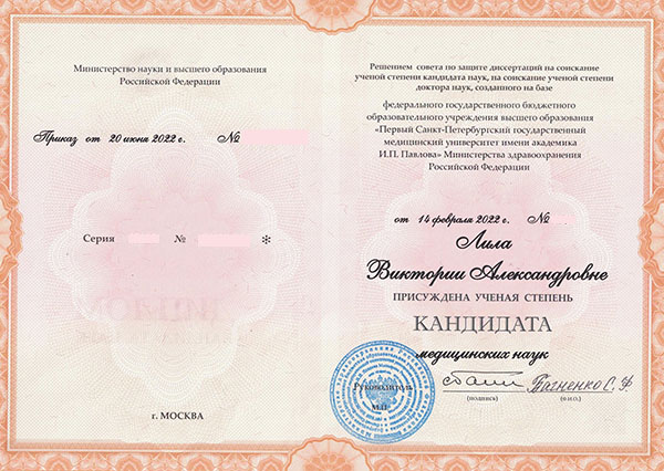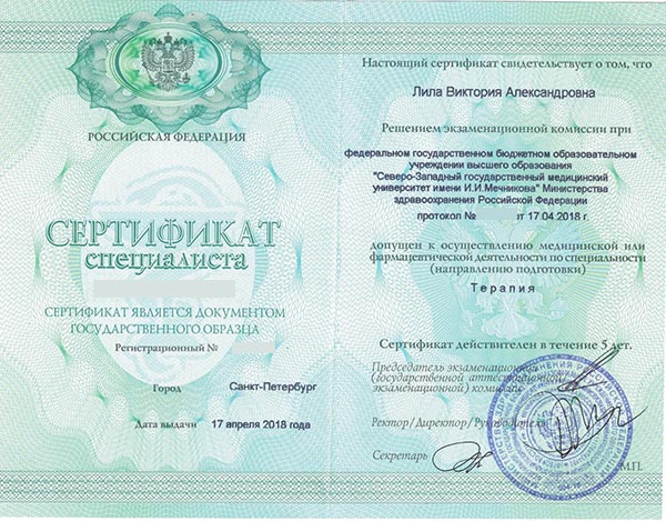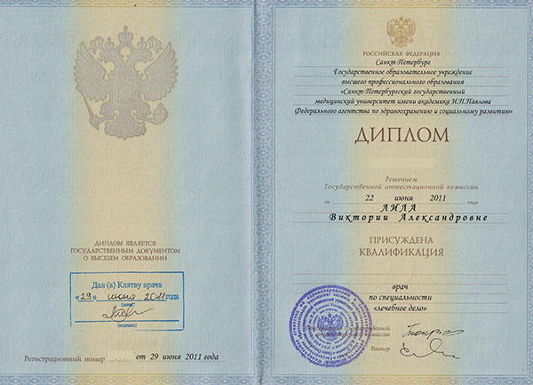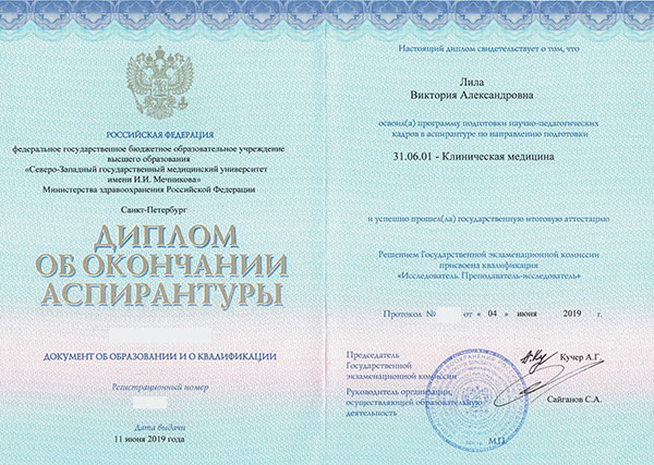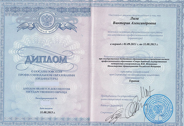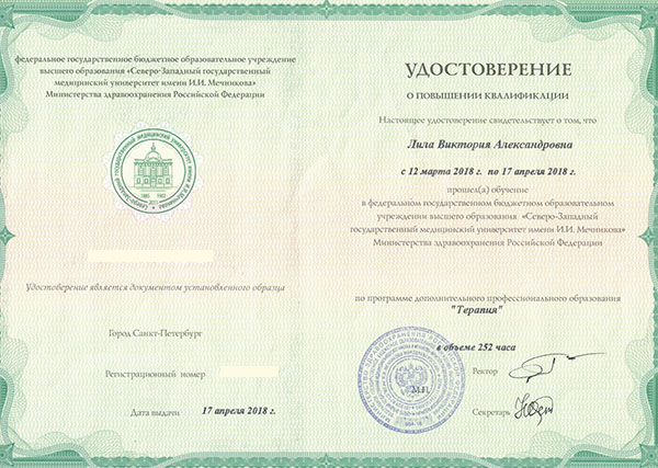 Лила Виктория Александровна в 2011 году окончила СПбГМУ им. ак. И.П. Павлова по специальности «Лечебное дело». Ординатуру, в 2013 году прошла при СЗГМУ им. И.И. Мечникова по специальности «Терапия».