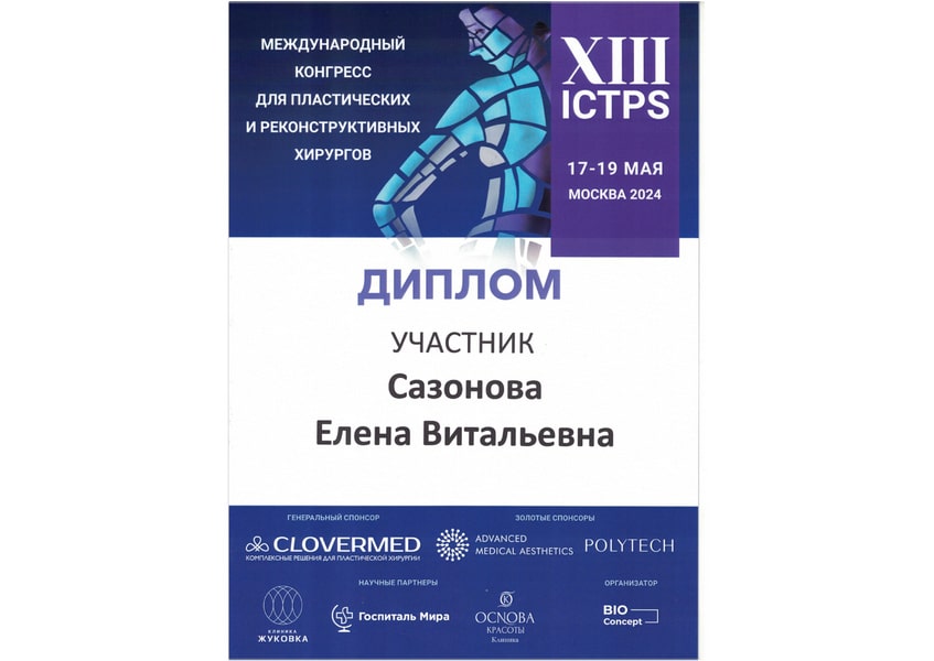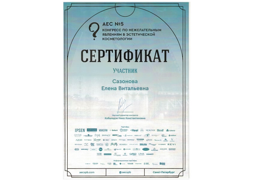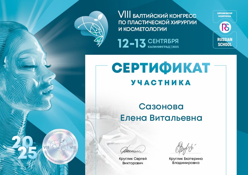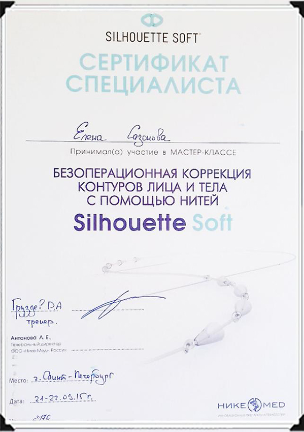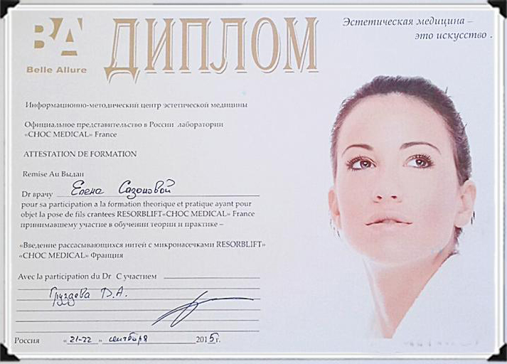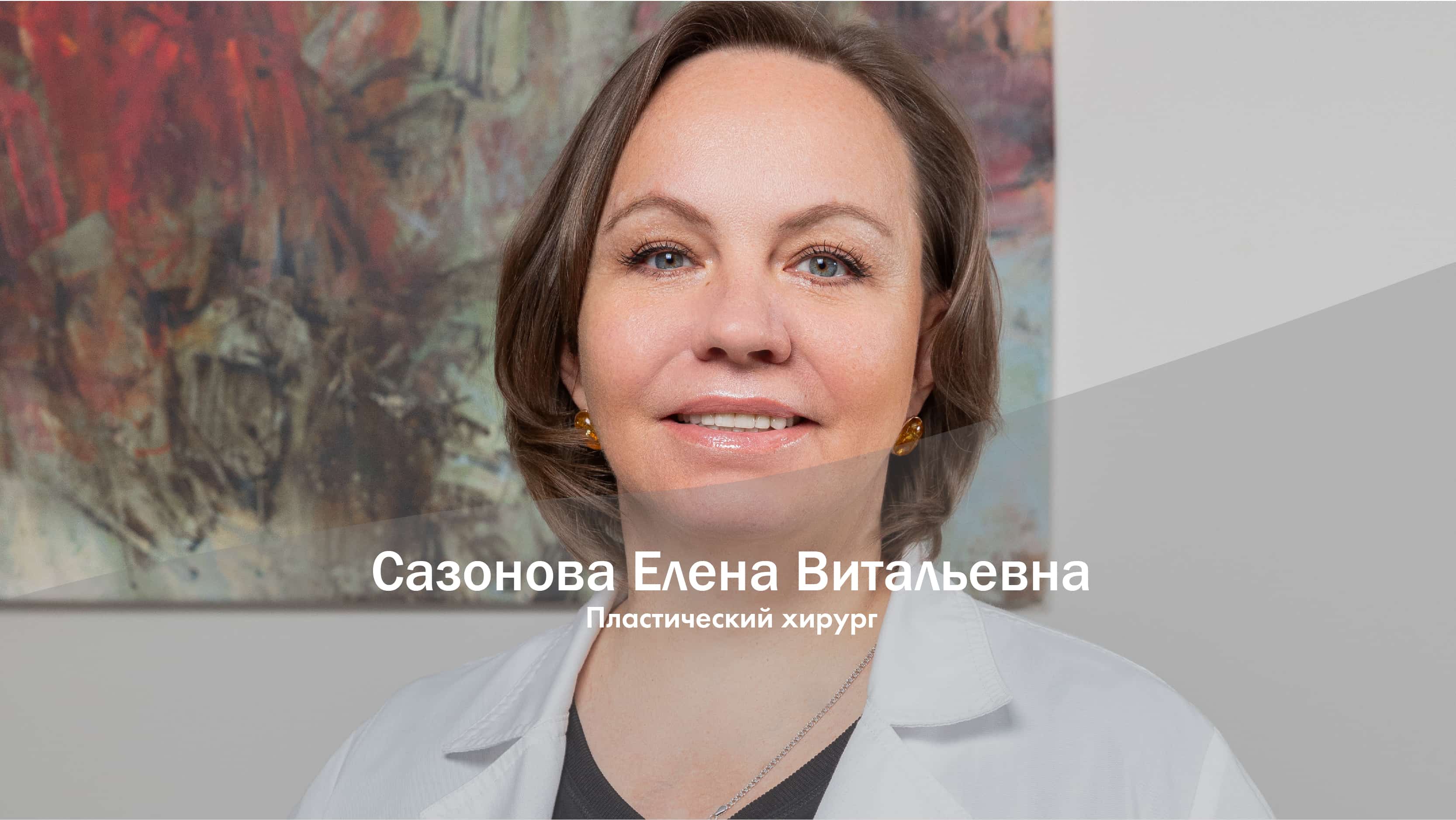 Елена Витальевна Сазонова окончила Ивановский государственный медицинский институт в 1994 году. Прошла повышение квалификации по хирургии, челюстно-лицевой хирургии, косметологии. Имеет ряд печатных работ, посвященных липомоделированию и абдоминопластике, нитевым методикам омоложения, опубликованные в российских и зарубежных научных изданиях.