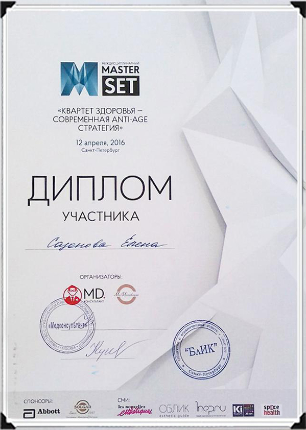 Елена Витальевна является постоянным участником отечественных и международных конгрессов (медицинского конгресса по косметологии в Монако, конгресса по пластической хирургии в Австралии, конгресса по лазерным методикам в Швейцарии).