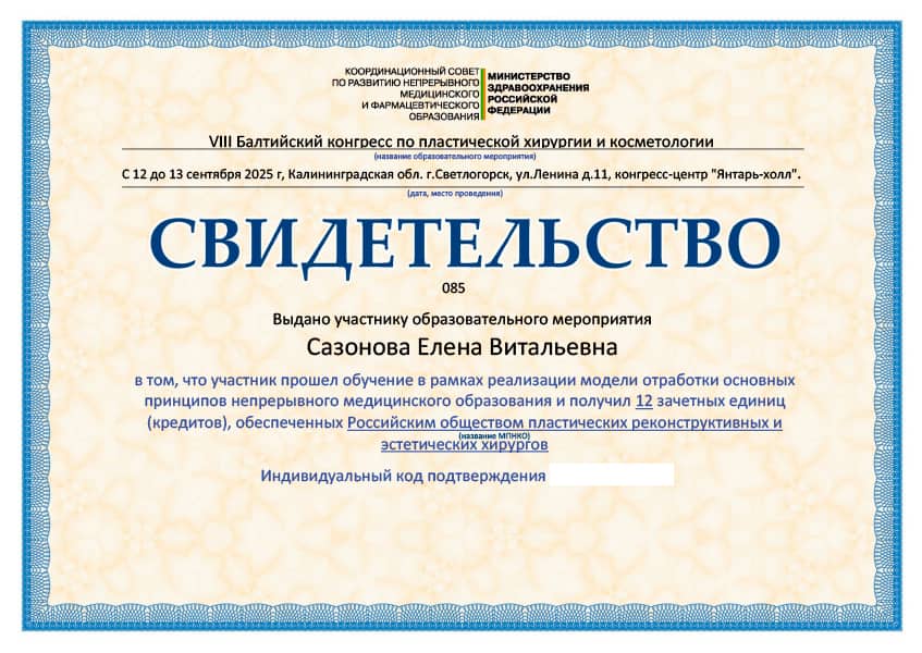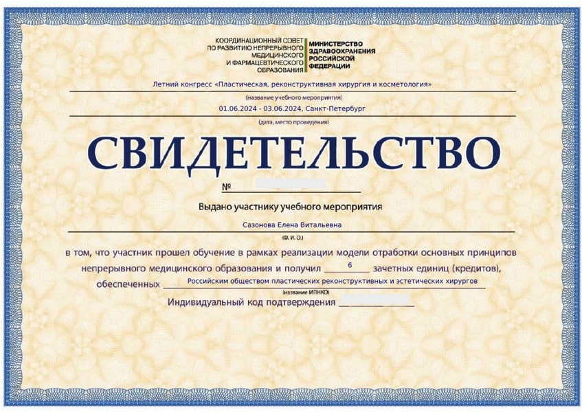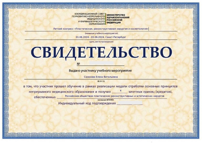 Елена Витальевна регулярно посещает семинары, в сфере ее интересов - бьютификация лица (нитевые методики омоложения - лифтинговые, армирующие, биостимулирующие и формообразующие), контурная пластика и интимная хирургия, трихология, Anti-Age.