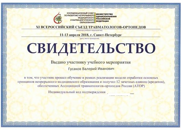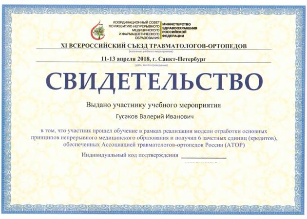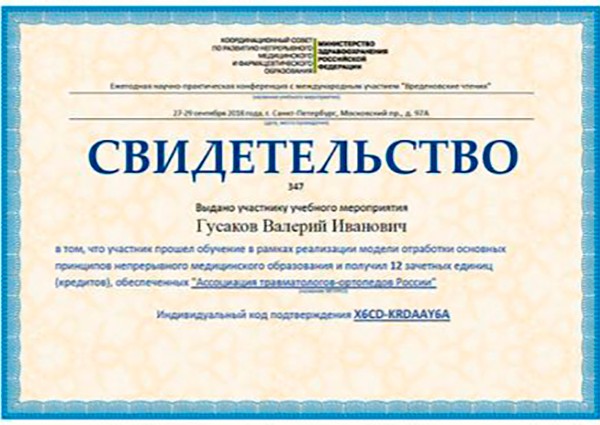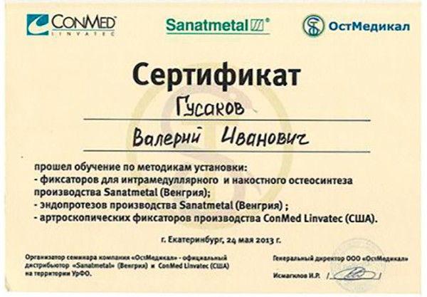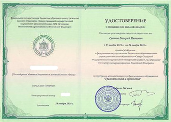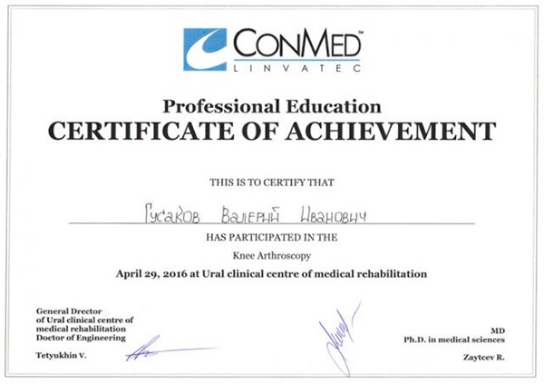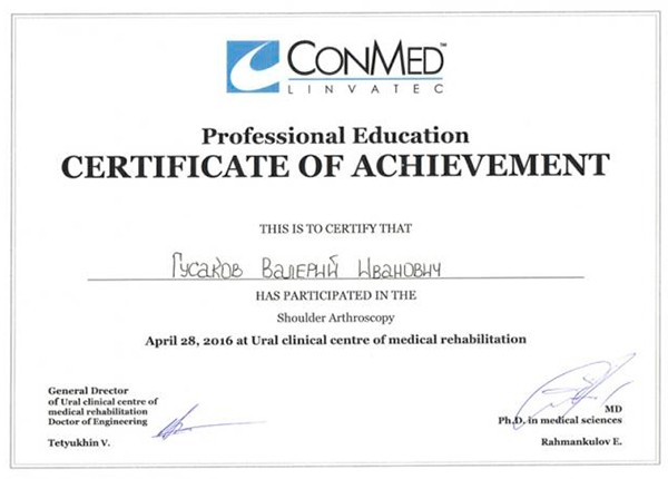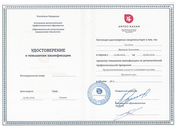 Большое внимание уделяет повышению квалификации, последние из пройденных циклов: лечебно-диагностическая артроскопия крупных суставов, базовая артроскопия коленного сустава, накостный и блокируемый интрамедуллярный остеосинтез, закрытый блокируемый остеосинтез.