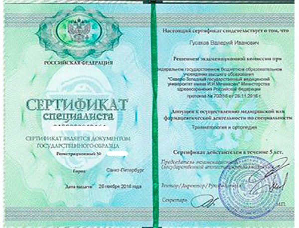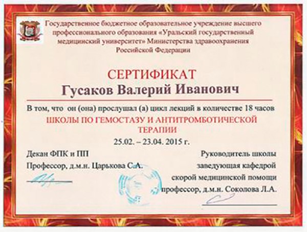 Гусаков Валерий Иванович в 1988 году окончил Свердловский государственный медицинский институт по специальности "лечебное дело". Интернатуру и ординатуру проходил на базе травматологического отделения Центральной городской больницы в г. Нижний Тагил.