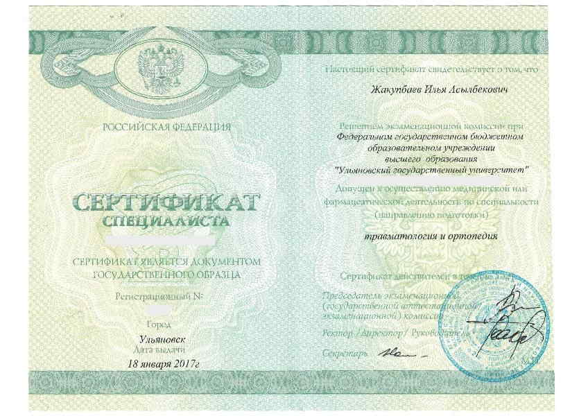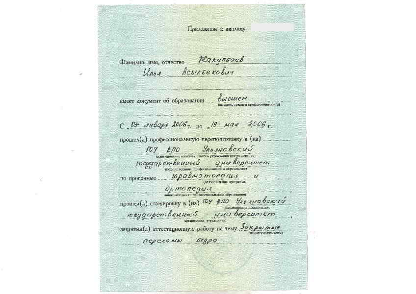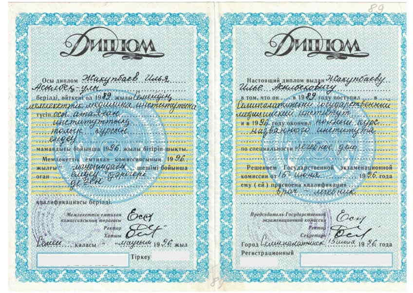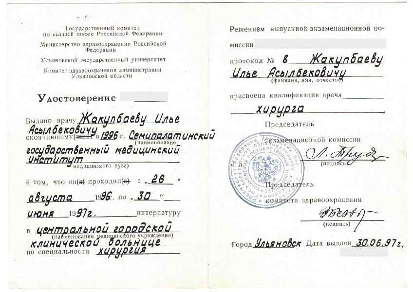 Жакупбаев Илья Асылбекович окончил Государственный Медицинский Университет г. Семей в 1996. В 1997 г. прошел интернатуру в г. Ульяновск.