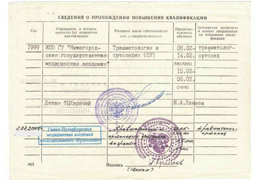 Повышал квалификацию в ИПО ГУ Нежегородская ГМА в 1999 г., Санкт-Петербургской медицинской академии последипломного образования в 2000 г., ГОУ ВПО Тюменской государственной медицинской академии в 2004 г., ГОУ ВПО Ульяновском государственном университете в 2006 г., ГОУ ВПО Тюменском государственном университете в 2011 г, Ульяновском государственном университете в 2016 г.