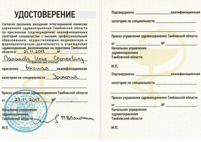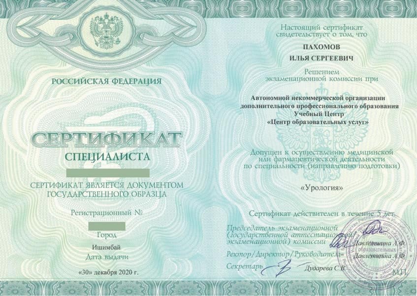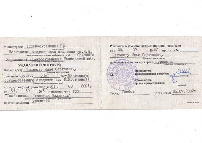 Пахомов Илья Сергеевич в 2001 году окончил Московскую медицинскую академию им. И. М. Сеченова, в 2002 - интернатуру по специальности "Урология" в Тамбовской областной клинической больнице, после чего возглавил урологическое отделение Уваровской ЦРБ.
