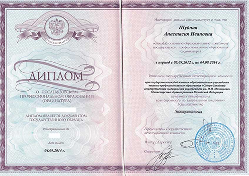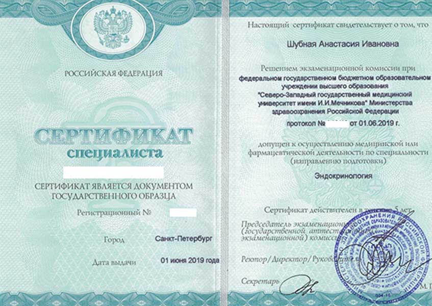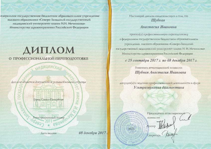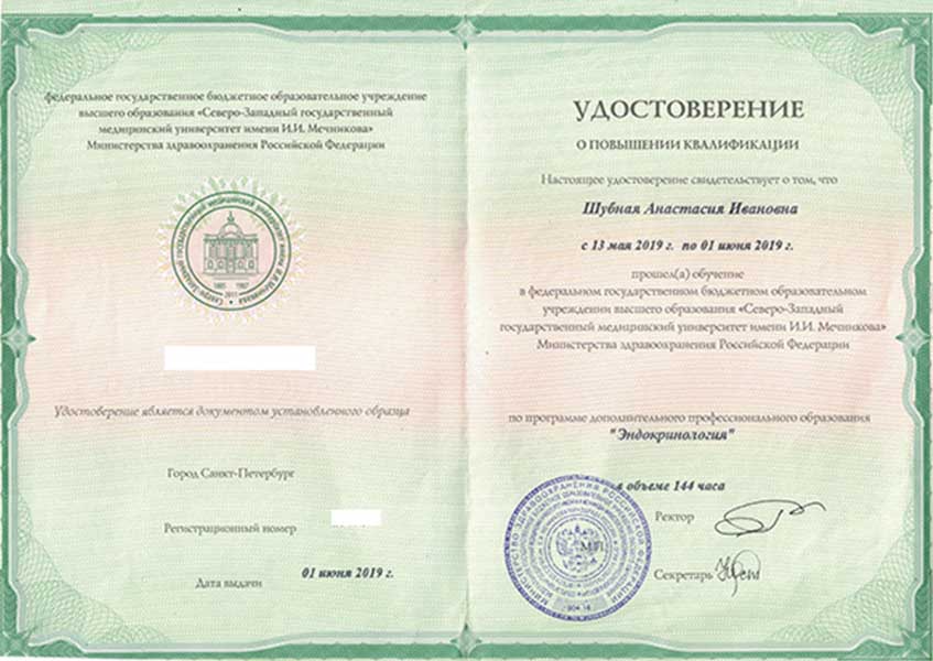 Шубная Анастасия Ивановна окончила Белгородский государственный национальный исследовательский университет по специальности Лечебное дело в 2011 году. Интернатуру прошла в Санкт-Петербургском институте усовершенствования врачей-экспертов ФМБА России по специальности «Терапия» в 2012 году, ординатуру по эндокринологии - в Северо-Западном государственном медицинском университете им. И.И. Мечникова.