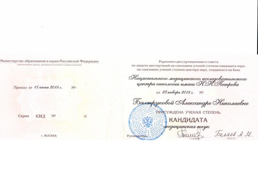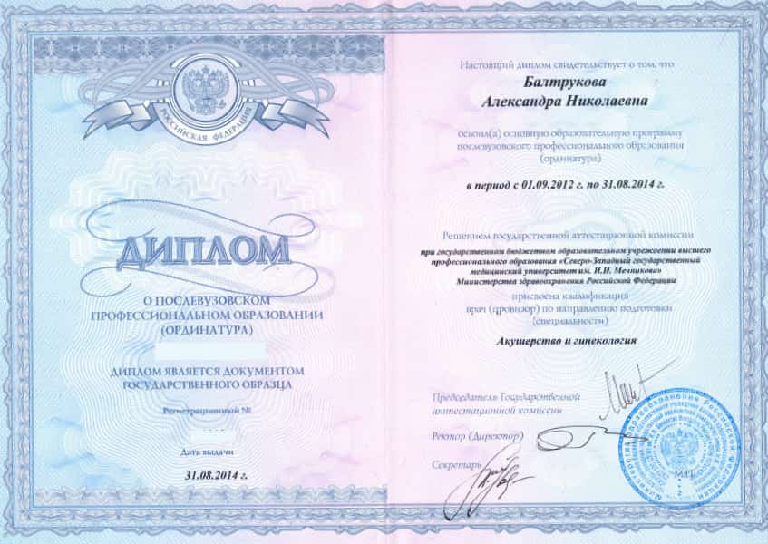 Балтрукова Александра Николаевна окончила ФГБОУ ВО «Северо-Западный государственный медицинский университет им. И.И. Мечникова» в 2012 году. Там же в 2014 году прошла ординатуру по специальности «Акушерство и гинекология». В 2017 году защитила диссертацию по теме «Сравнительный динамический анализ особенностей опухолевого процесса и гормонально-метаболического статуса больных при раке эндометрия».