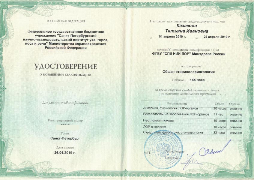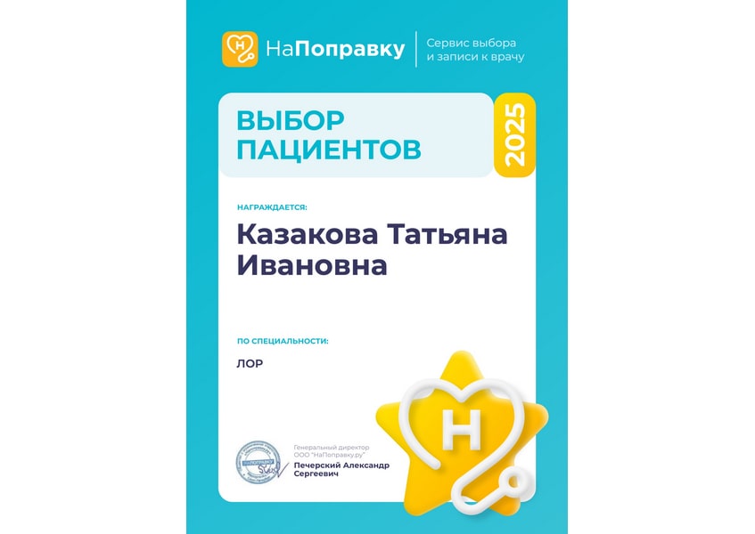 - Аккредитация по специальности «Оториноларингология» обновлена в 2024 году.