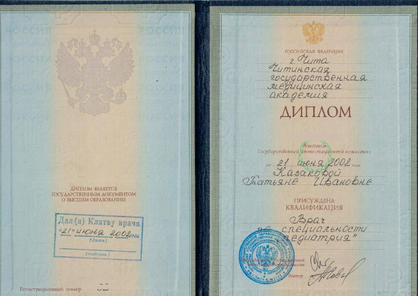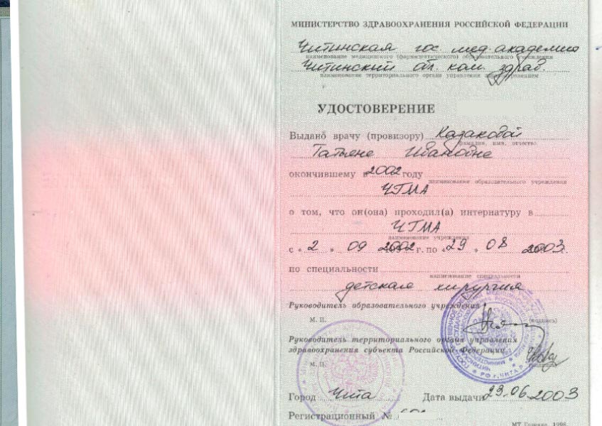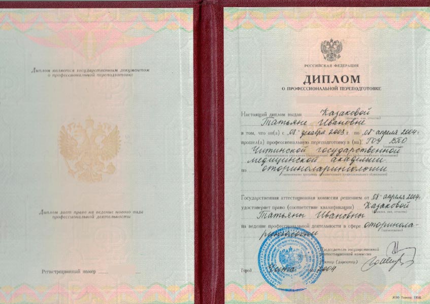 Казакова Татьяна Ивановна окончила Читинскую государственную медицинскую академию по специальности "Педиатрия" в 2002 году. Прошла интернатуру в Краевой детской клинической больнице по детской хирургии в 2003 году и ординатуру по оториноларингологии в 2004 году.