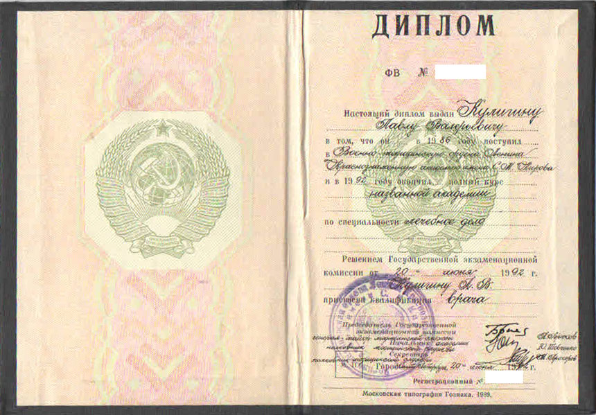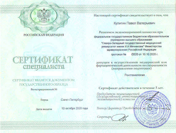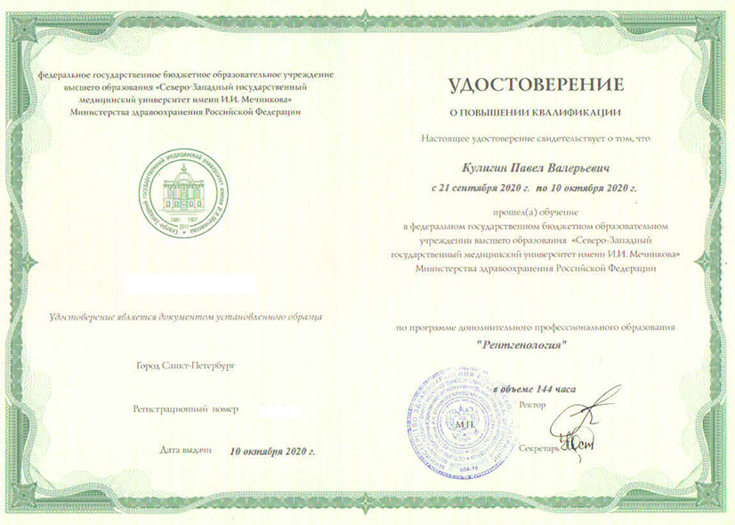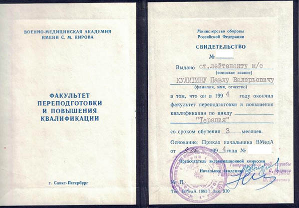 Кулигин Павел Валерьевич окончил Военно-Медицинскую академию им. С. М. Кирова по специальности «Лечебное дело» в 1992 г. Интернатуру и ординатуру прошел в ГВГ СЗГВ г. Рига.