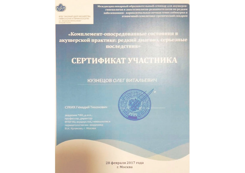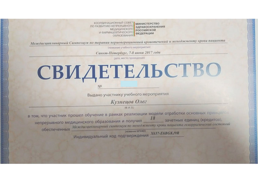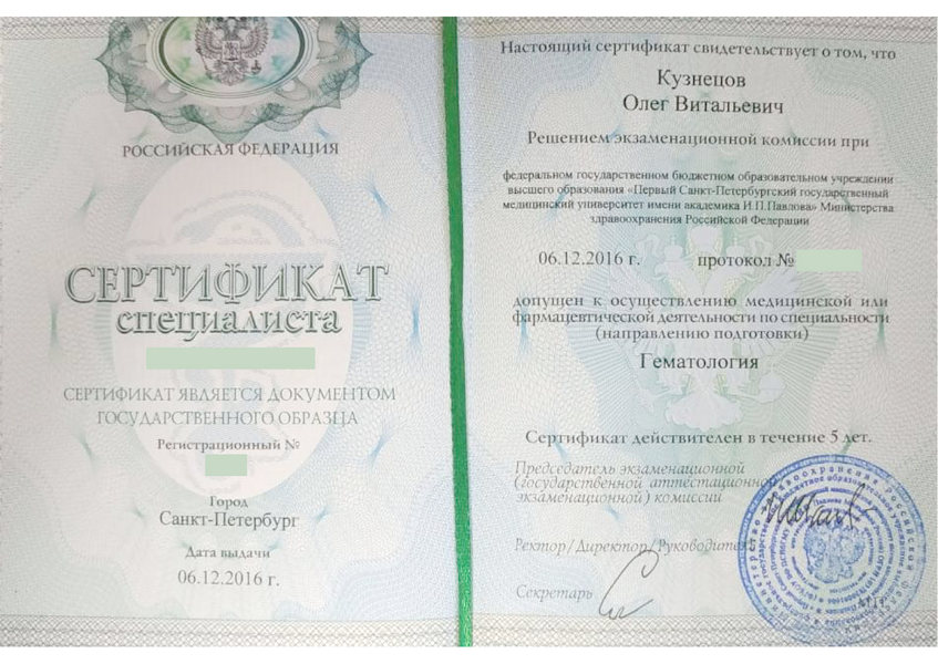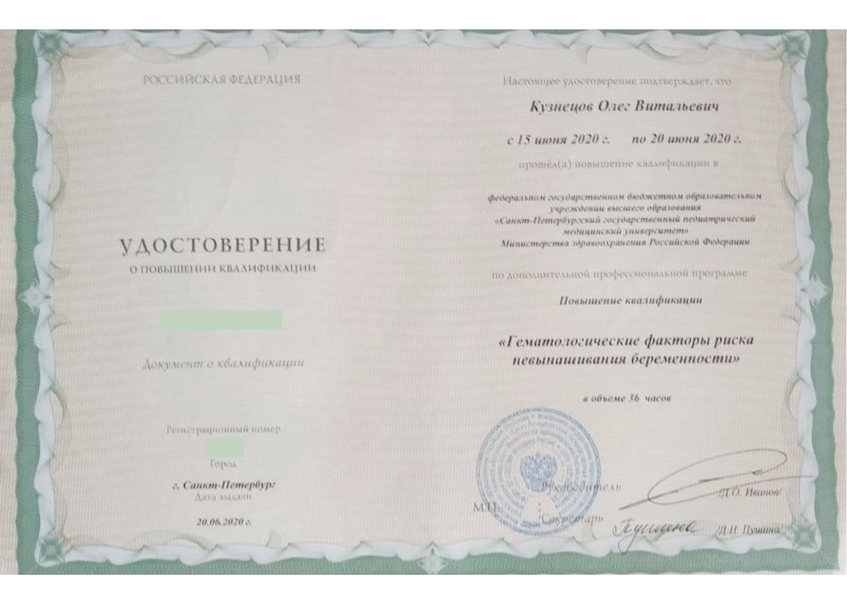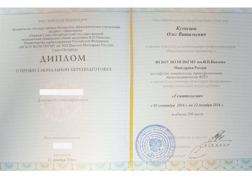 - 2016 - профессиональная переподготовка по специальности «Гематология» в (ПСПбГМУ им. И.П. Павлова на кафедре гематологии, трансфузиологии, трансплантологии ФПО)